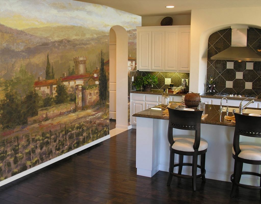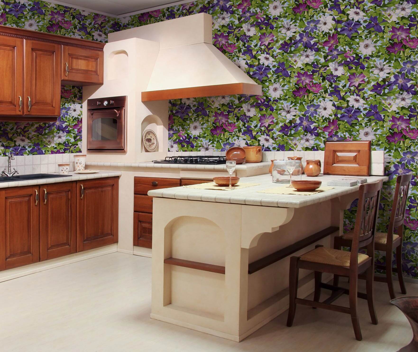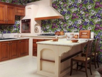 Les styles les plus populaires pour la conception des cuisines sont aujourd'hui américain, vintage, scandinave et méditerranéen. Dans la dernière version du papier peint aura l'air à la mode sous la pierre. Reste pertinente l'utilisation de nuances naturelles de sable, de terre brûlée, des modèles thématiques comme "azulezhu". Cet intérieur aura un caractère authentique.