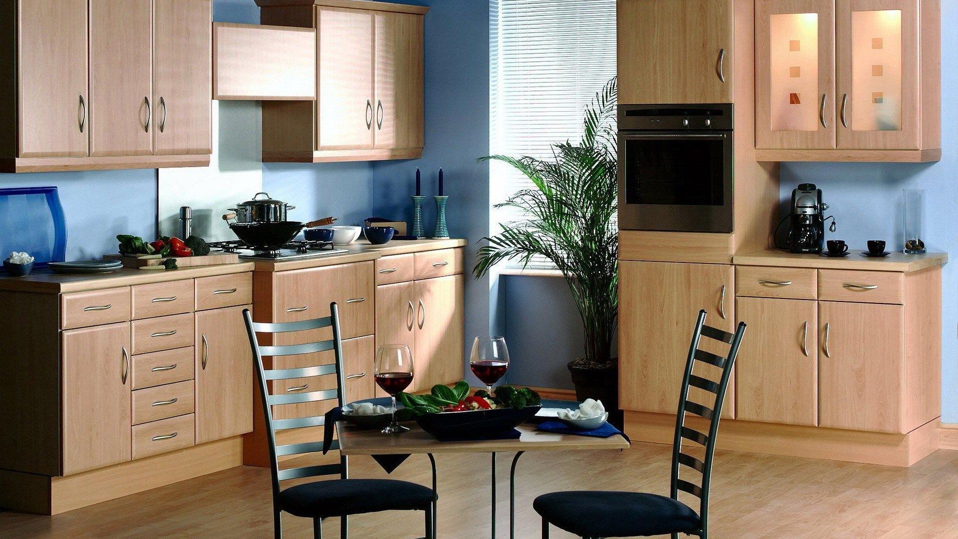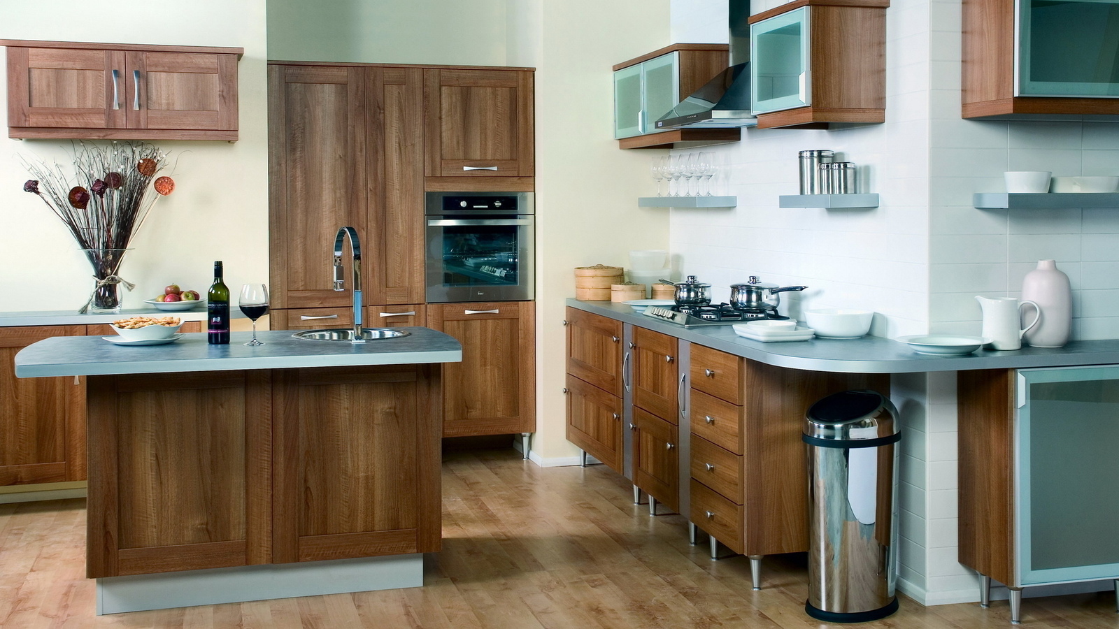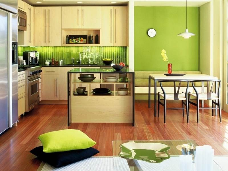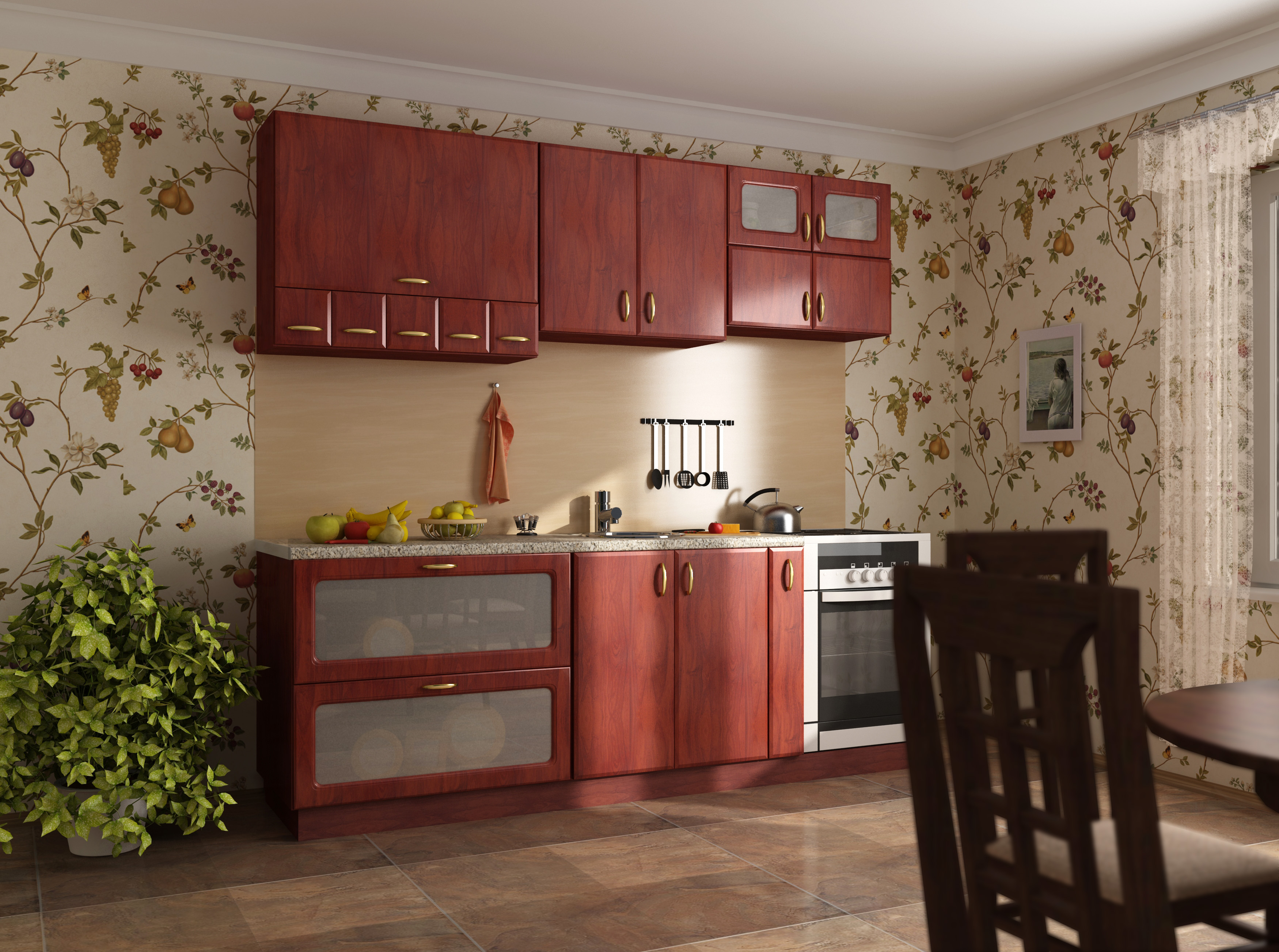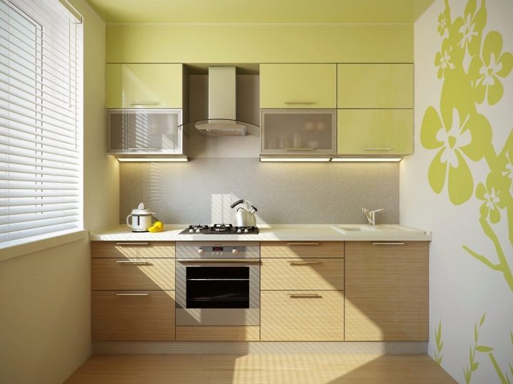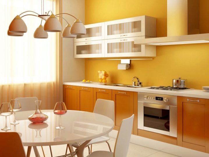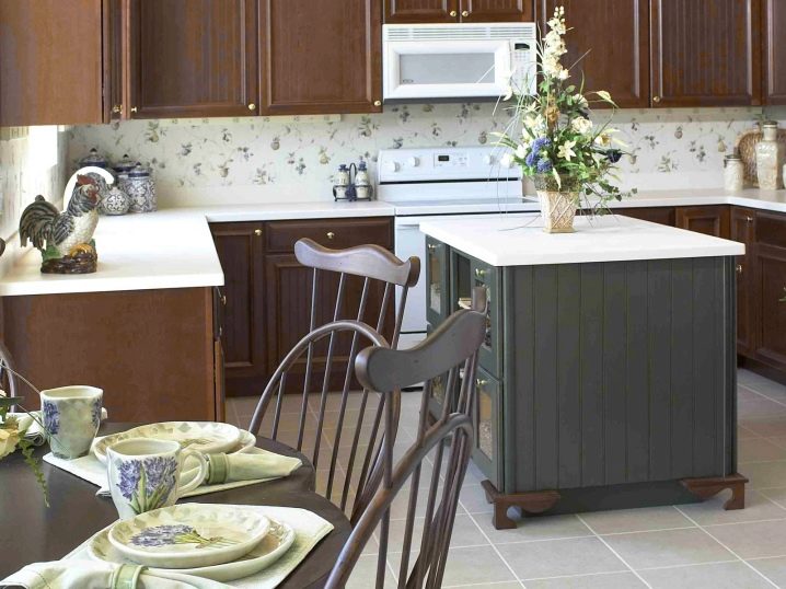 Toute conception de cuisine doit venir non seulement de l'esthétique et de la beauté, mais aussi de la praticité des matériaux utilisés. Si le meuble est en bois massif, il est nécessairement recouvert d'un mélange hydrofuge, de vernis, résistant à la saleté, aux taches grasses, etc. Si le revêtement de sol est lavable (carrelage, stratifié, etc.). Les papiers peints doivent également être lavables. Les meilleurs choix seront les modèles non tissés, en vinyle et en fibre de verre.