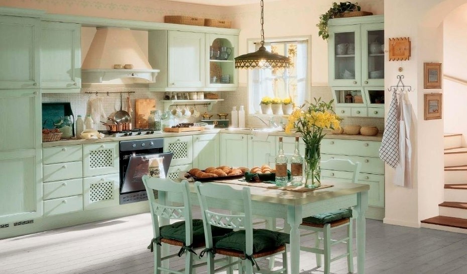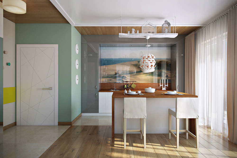 Les empreintes d'animaux de la forêt, d'éléments graphiques, de motifs floristiques et marins restent pertinentes.Le concombre indien à la mode, une cage provençale, des "pois" élégants, une peinture à l’acrylique sont encore à la mode. Vous pouvez peindre les murs de la cuisine en turquoise, dans les tons indigo, outremer, corail, citron vert, pêche pâle. Vous ne pouvez pas vous tromper si vous combinez une palette de gris et violet, vert émeraude, cerise, beige.