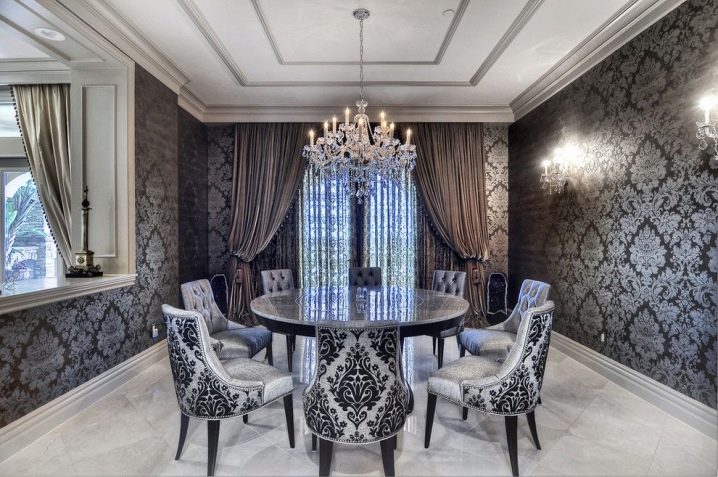Pour les intérieurs chics, vous pouvez coller des papiers peints pratiques avec une imitation exclusive de velours, velours et autres matériaux coûteux. En utilisant le thème de l'Est, vous risquez d'être qualifié de voisin extravagant de la maison. Les options intéressantes seront une combinaison de gris avec le jaune, l’orange et d’autres couleurs panachées.