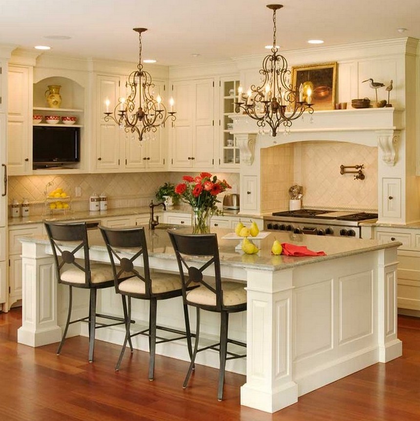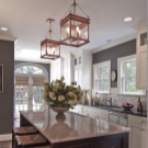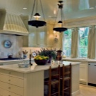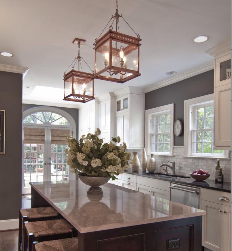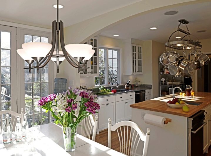 Lorsque vous choisissez un lustre dans la cuisine, faites attention à sa taille. Dans la spacieuse cuisine-salle à manger peut être placé au centre d'un grand lustre et une petite lampe dans la zone de travail.
