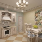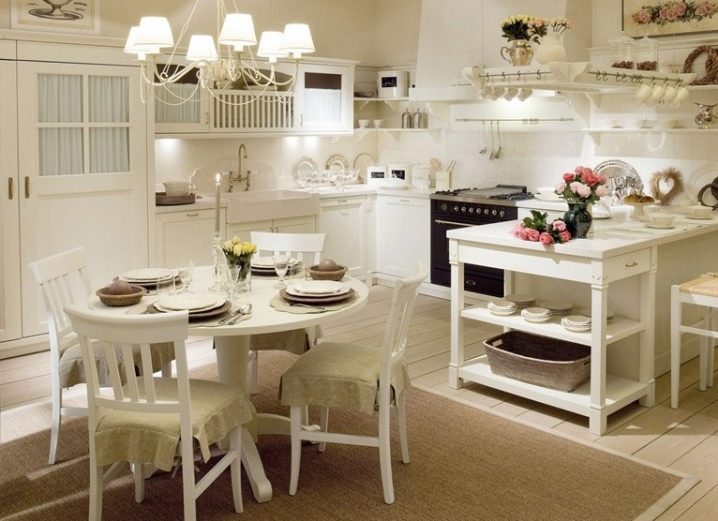 Les accents de la cuisine sont placés sur des tissus naturels - une nappe de fleur, inspirée du thème des animaux ou dans un style marin, des canapés moelleux avec des petits coussins en lin, des serviettes et des serviettes en tissu, des glands sur les poignées et les portes de meubles.