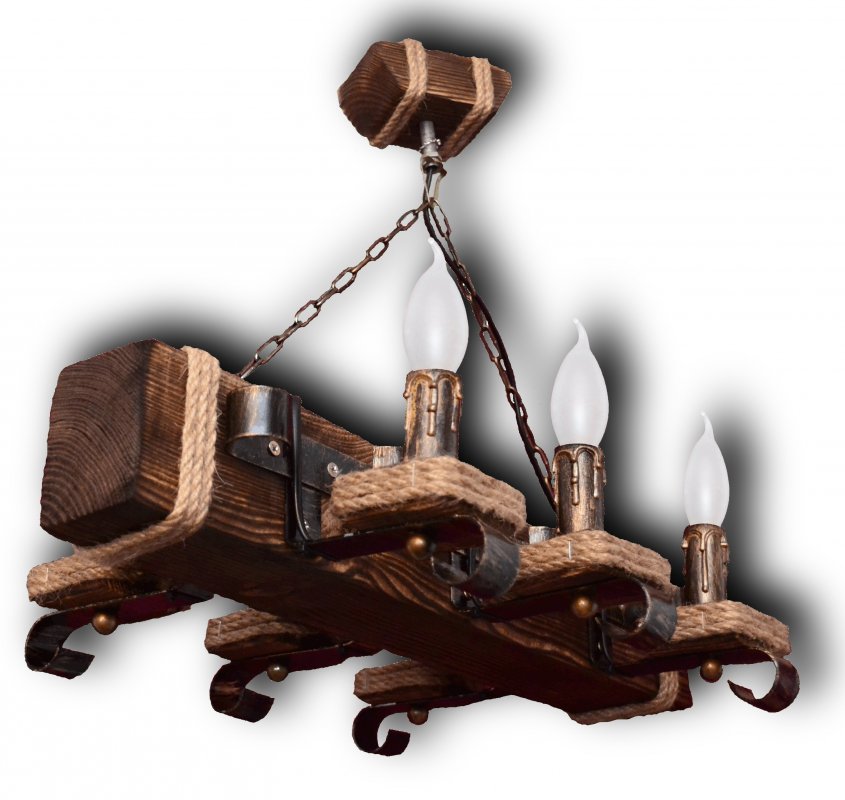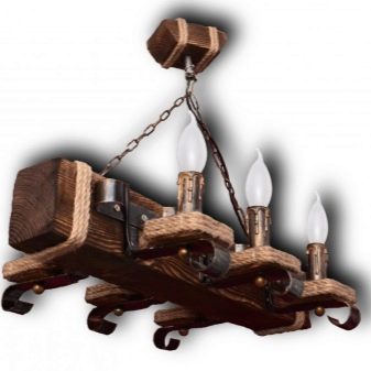 Le matériau du lustre doit être naturel. Il semble parfait lustre en bois avec des éléments de bronze, cuivre, laiton. Le métal est parfaitement combiné avec du bois de toutes les couleurs. Le cadre légèrement grossier d'un lustre en bois sera adouci par un abat-jour en tissu placé au centre de la cuisine au-dessus de la table; un tel lustre attirera certainement l'attention.