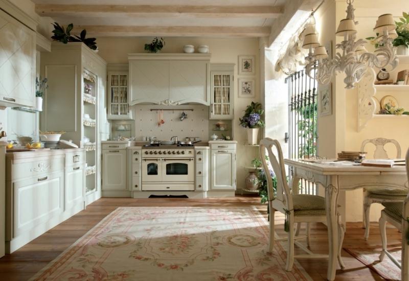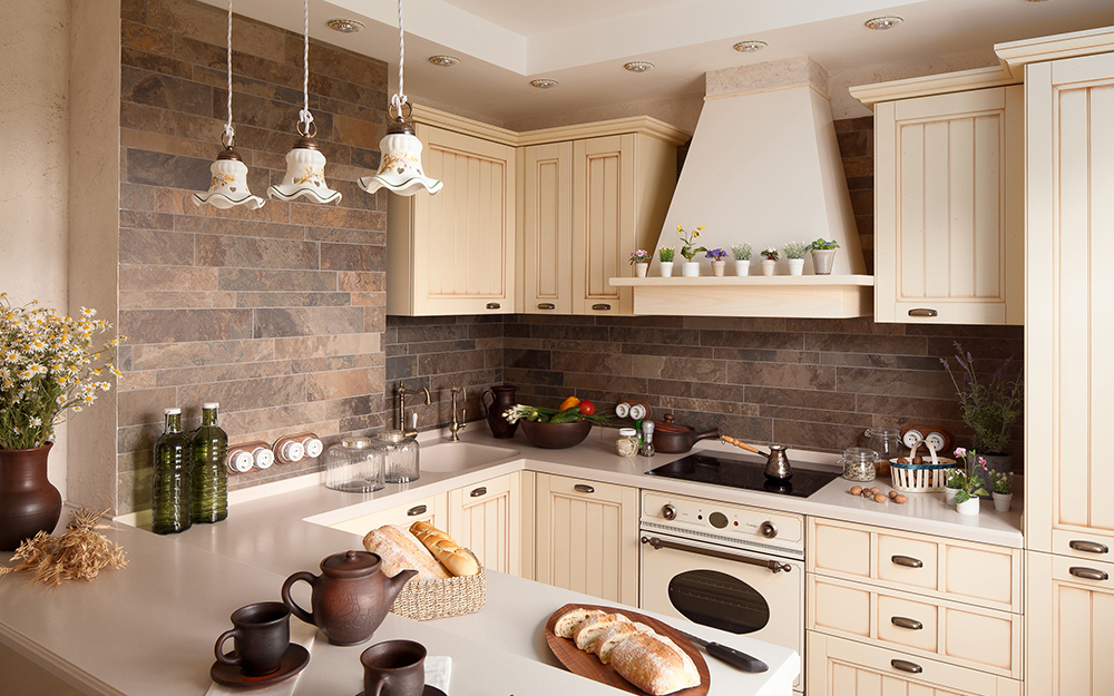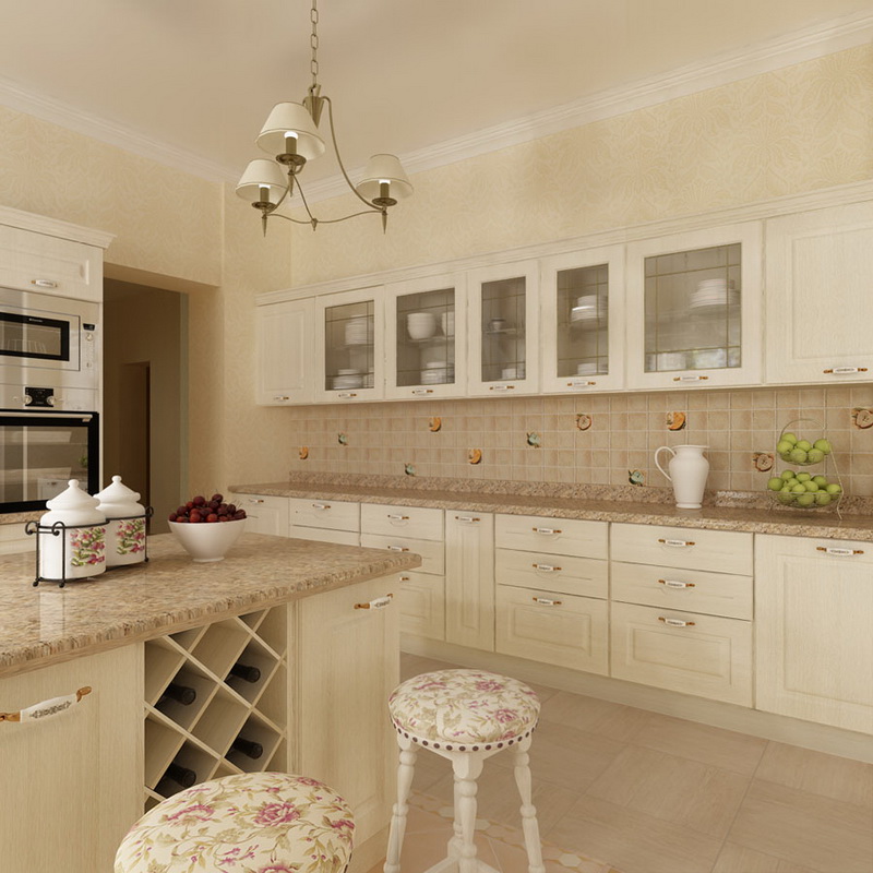 Les murs de la cuisine dans l'esprit de la "Provence" recouverts de peinture ou de papier peint de couleurs pastel avec des ornements floraux. Sur le sol, utilisez le plus souvent des stratifiés de races naturelles de chêne, de noyer ou de céramique, imitant la structure de l’arbre.