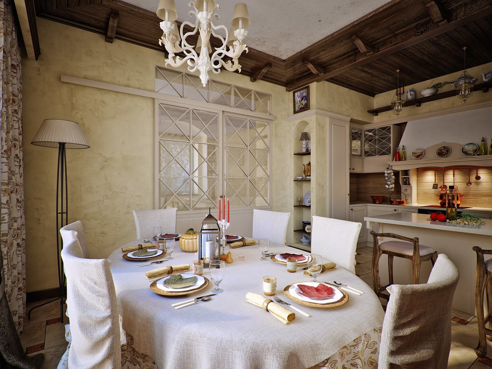Rendre la cuisine dans le style provençal ne pas oublier l'éclairage, douce douce agréable, lumière légèrement étouffée soulignent expressément le style harmonieux.