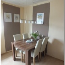 Les lustres de cuisine de style moderne sont très originaux et concis. Accent mis dans un lustre clair dilué de couleurs marron et blanc avec des nuances verticales. L'harmonie du concept ajoutera des tons neutres au papier peint et à la table de salle à manger.