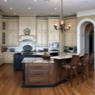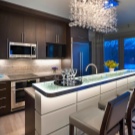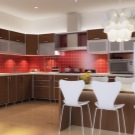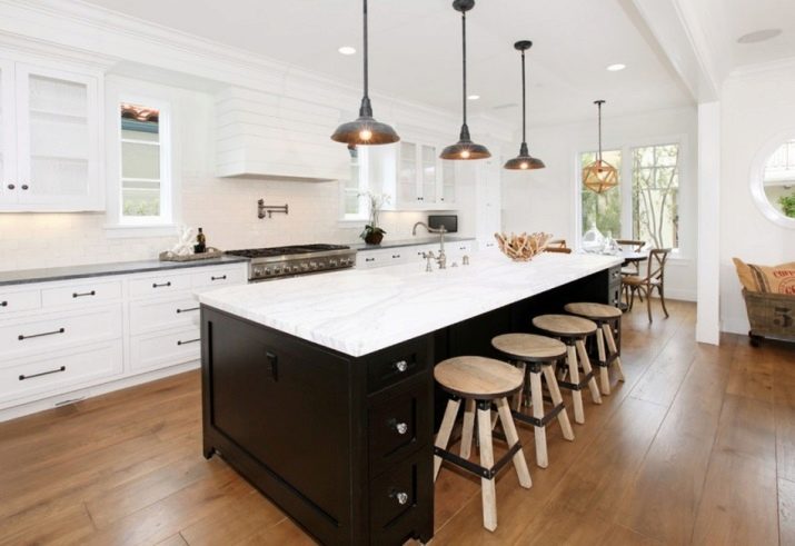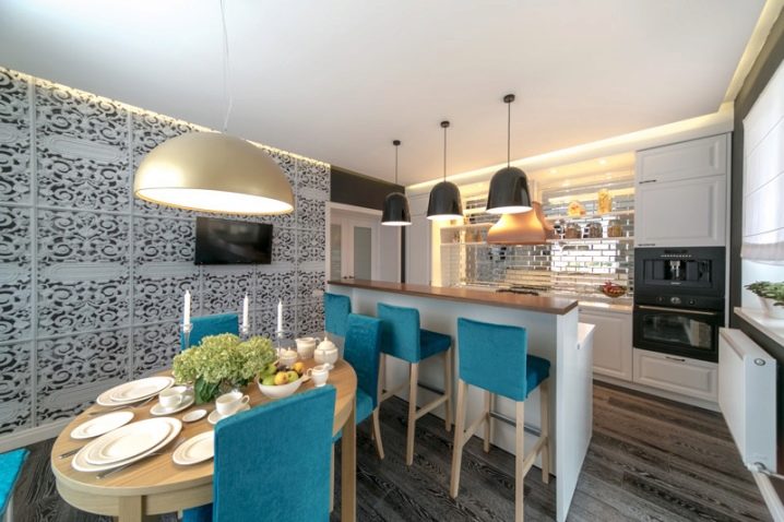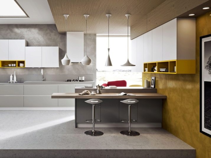 Une autre difficulté pour choisir un lustre dans la cuisine sera la présence d'un comptoir de bar. La lumière pour le comptoir du bar joue un rôle très important non seulement pour éclairer la pièce, mais également pour créer l'ambiance appropriée. En règle générale, il est habituel de placer des suspensions encastrées dans le plafond au-dessus du comptoir. La forme et la couleur de ces lampes peuvent être très diverses. Il est important de comprendre que les experts ne recommandent pas de choisir des lampes avec une source de lumière différente.Par exemple, au-dessus du bar, il y aura un lustre avec une lumière chaude et au-dessus de la zone de travail avec un froid. Cette option devrait être supprimée.
