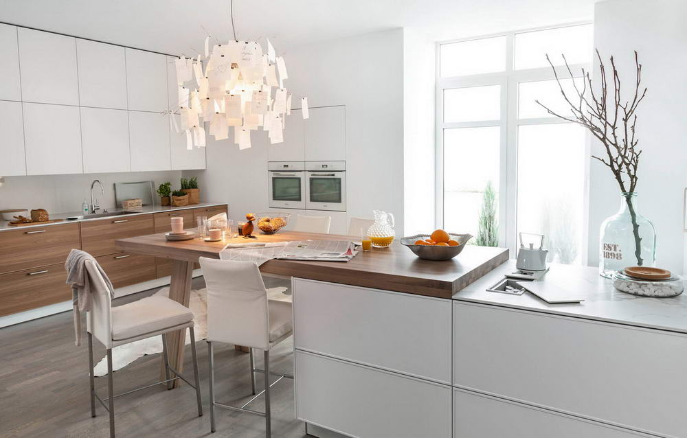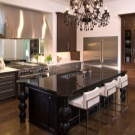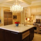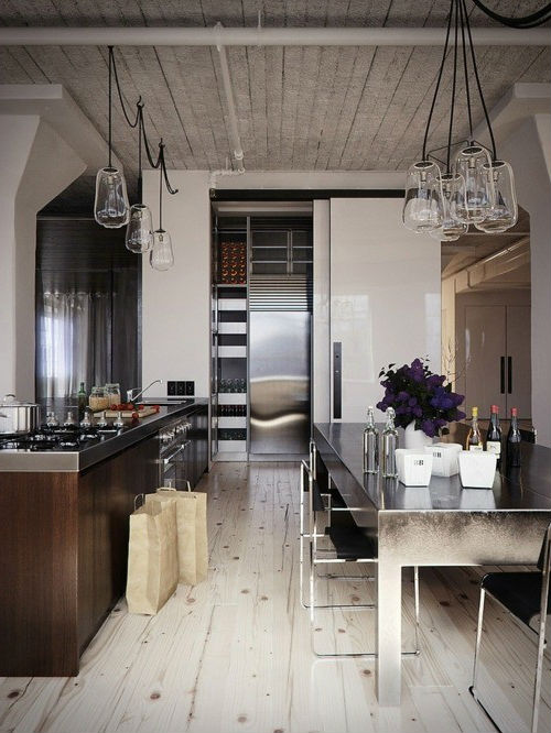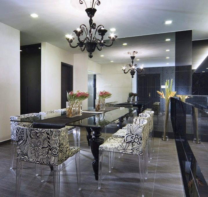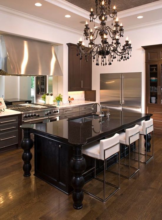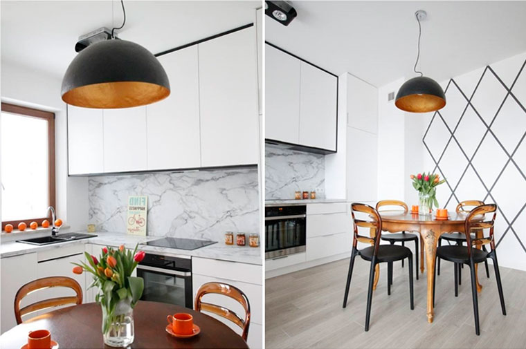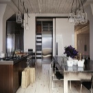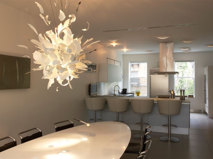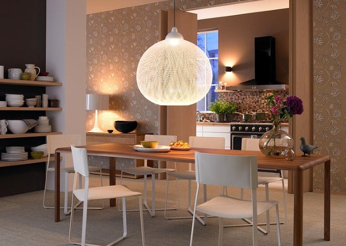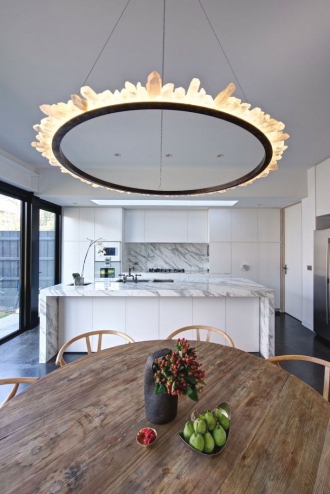 Facile à choisir des modèles de lustres pour les cuisines spacieuses. Une solution de conception intéressante sera de les placer à différents niveaux. L’essentiel est que le lustre respecte les paramètres de sécurité nécessaires et satisfasse les propriétaires.