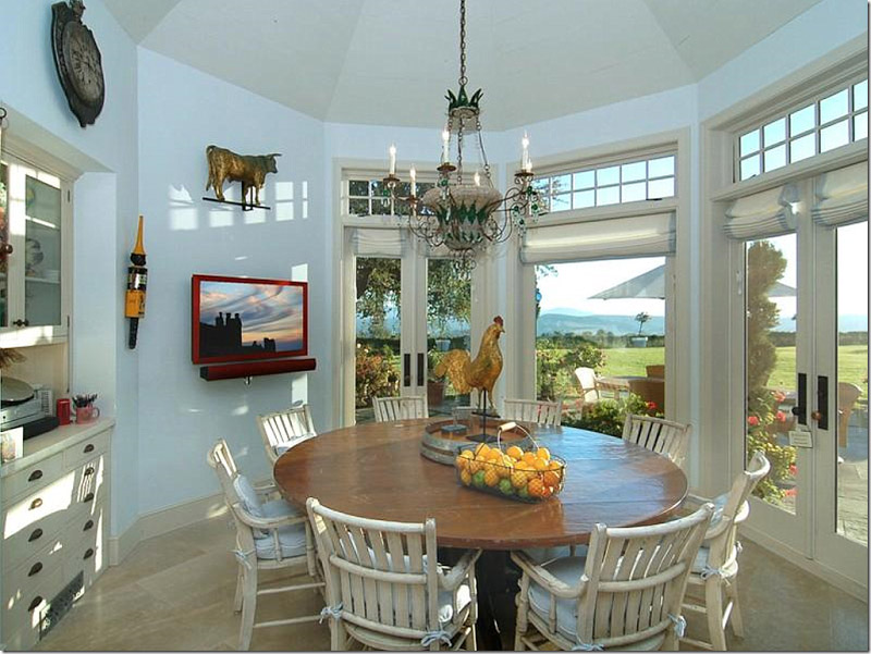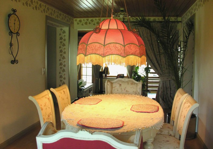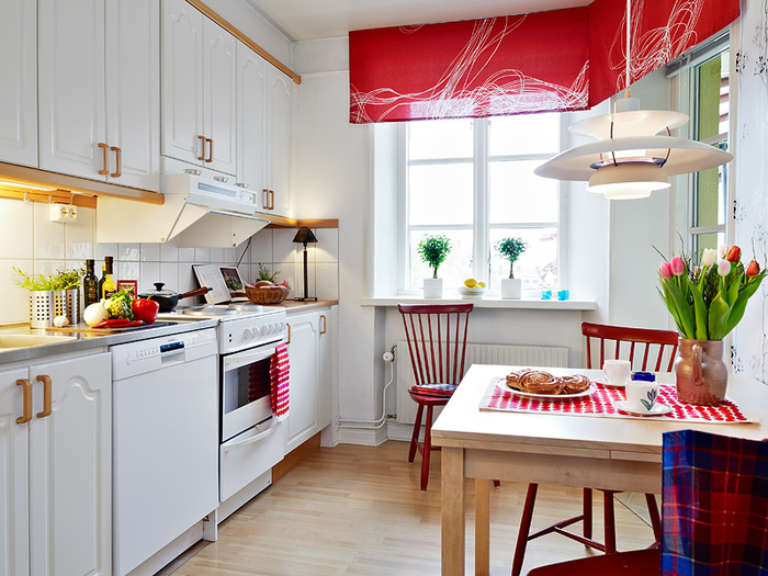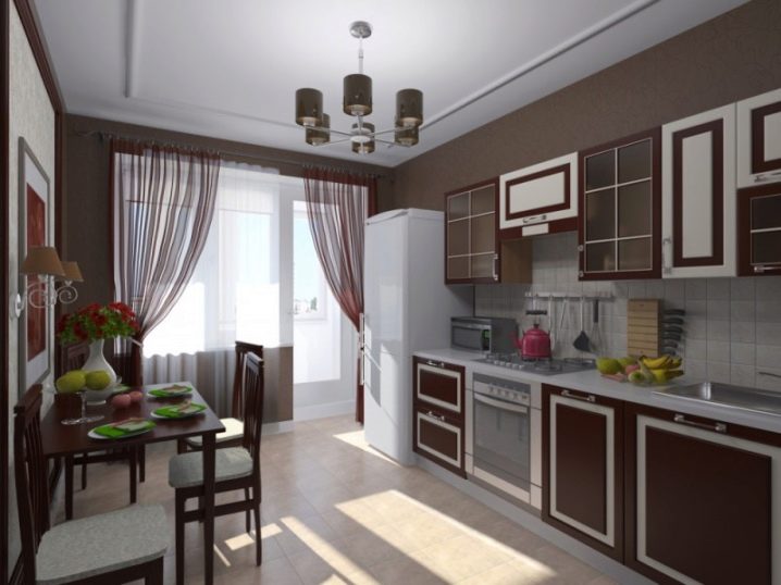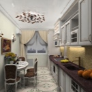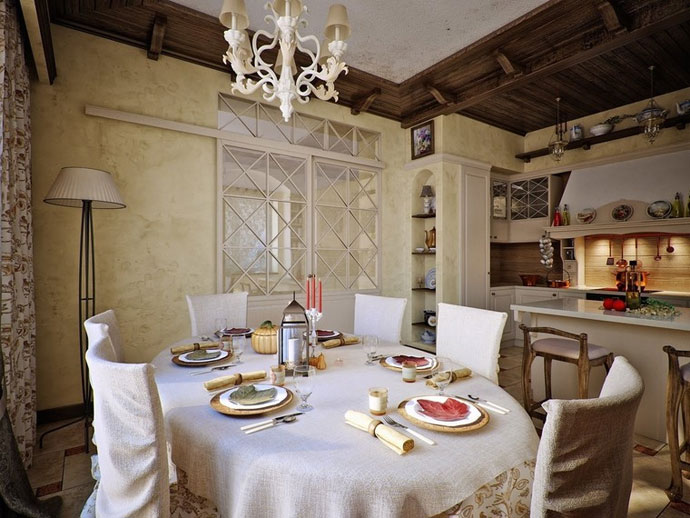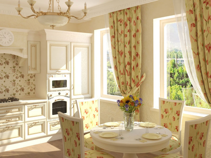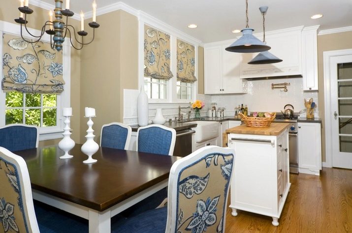 Pour une cuisine de style campagnard, choisissez un lustre lumineux avec des nuances de bougies. Les tons neutres de la cuisine et des meubles diluent les rideaux brillants de la fleur. Dans le ton des rideaux peuvent être choisis et un rembourrage sur les chaises.