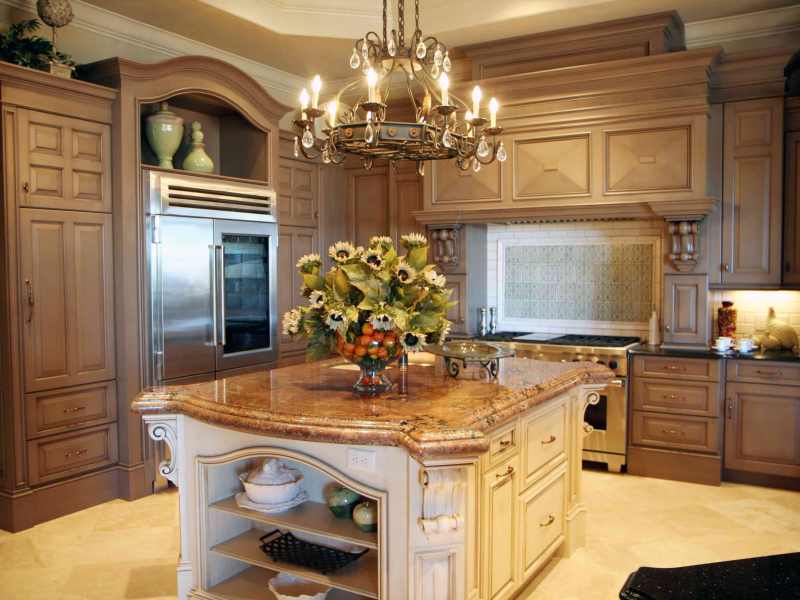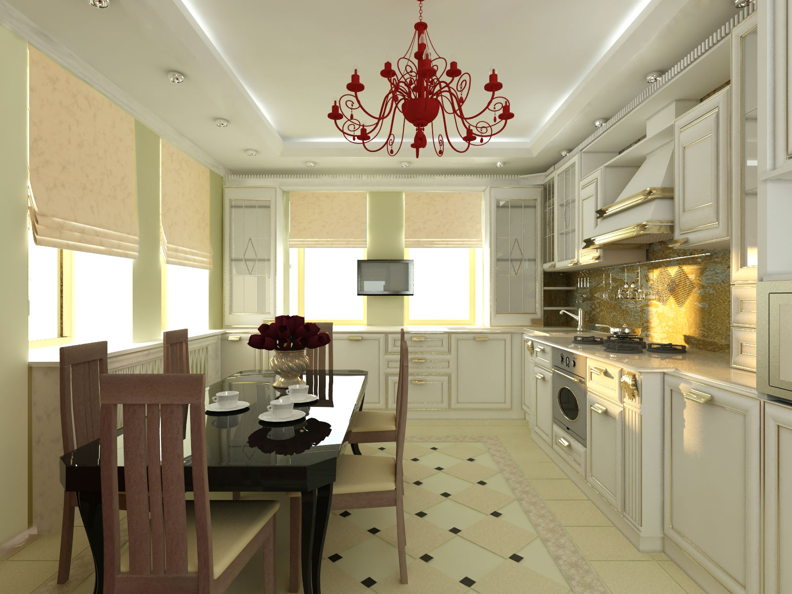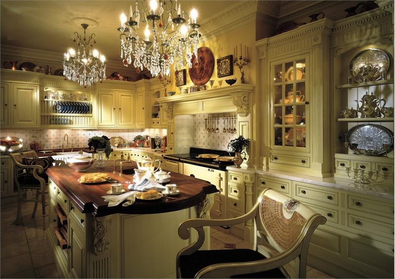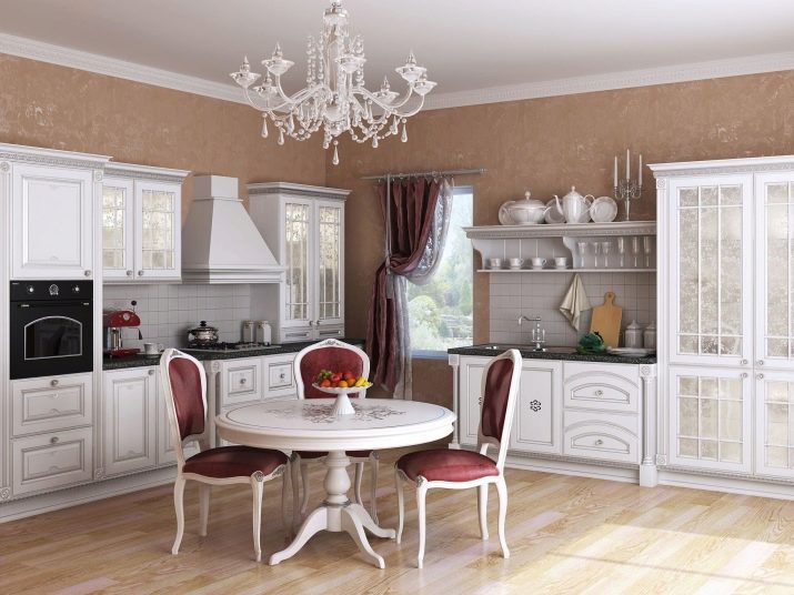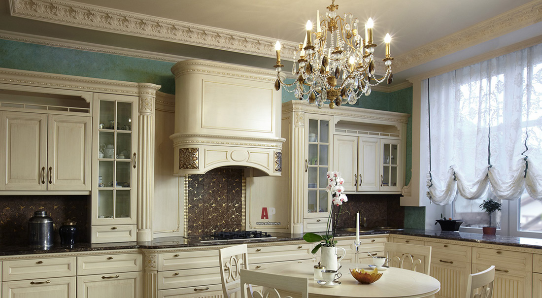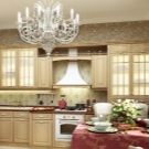 Le choix des modèles est énorme. Reste à déterminer la combinaison à l'intérieur. La cuisine classique implique la présence d'un lustre en cristal chic. Mobilier sculpté blanc, set de cuisine et buffet en combinaison avec des murs neutres et un tel lustre semblent luxueux.Pour une cuisine classique, un lustre similaire est l'option idéale.