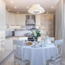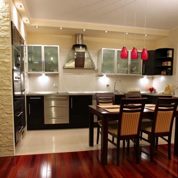 Les lustres de plafond sont souvent placés au centre de la cuisine. Cette règle concerne les lustres qui seront la principale source de lumière. Pour la cuisine miniature des ménagères, vous pouvez appliquer le cours suivant. Au-dessus de la table, placez un lustre avec une lumière peu brillante et diffuse. Et au-dessus de la zone de travail pour monter des lumières LED. Pour les grandes pièces, il est préférable d’utiliser deux lustres du même style.L'un peut être placé au-dessus de la table à manger et le second au-dessus de la zone de travail ou dans le salon, si l'appartement est un studio.