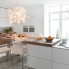 - Le design de la cuisine moderne permet la présence de lustres modernes de forme irrégulière. Un tel modèle peut être fabriqué avec les matériaux les plus modernes. Les lustres suspendus sont autorisés des verres, des boules, des cubes ou des cylindres.