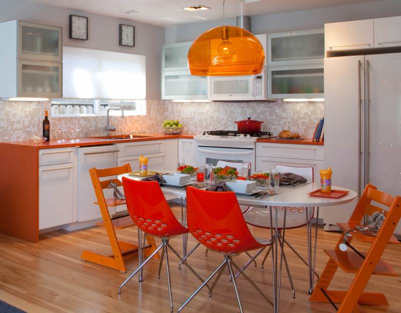 - Orange. Une des couleurs fréquemment achetées pour la cuisine et la salle à manger. Le lustre orange incarne la bonne humeur, la bonne humeur et une couleur plutôt appétissante.