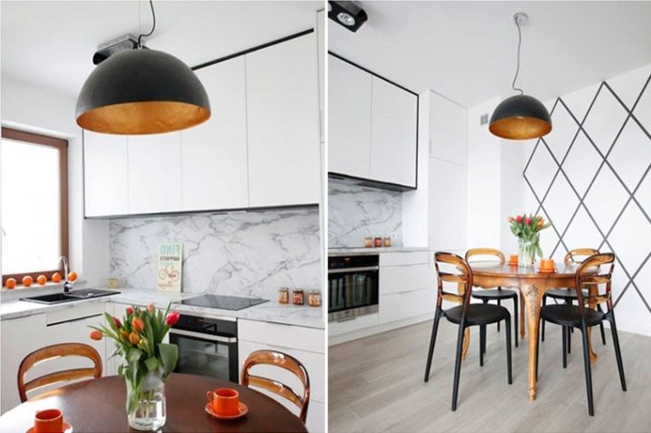 Lors du choix d'un lustre, il est important de prendre en compte la taille de la cuisine. Dans une cuisine miniature avec un plafond bas, il est préférable de placer des lustres hauts. Les lustres suspendus dans cette situation auront l'air très encombrant et rendront la pièce accroupie. Les modèles dotés d'une suspension longue et de plafonniers de petite taille doivent être choisis pour les cuisines étroites ou allongées. Au détriment des lampes stylées, la pièce sera plus intéressante et plus créative.
