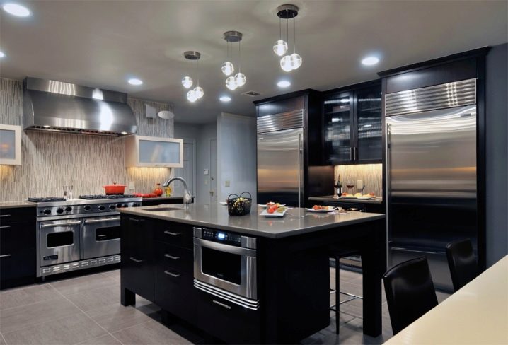 - Noir. Couleur très non standard et à quelques endroits cela conviendra. Ces lustres doivent être choisis si la cuisine est décorée dans un style gothique ou baroque. Dans un intérieur similaire, le plafonnier crée un effet dramatique. C'est fini, un tel accent est difficile à ne pas remarquer.Le lustre noir souligne parfaitement la blancheur du plafond et ombrage bien toutes les surfaces claires.