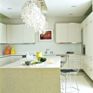 La meilleure option pour la zone de cuisson est le verre et le plastique. Les lustres de ces matériaux sont les moins pollués et n'absorbent pratiquement pas les odeurs, et il est très facile de laver la graisse et la suie avec une éponge et un détergent.