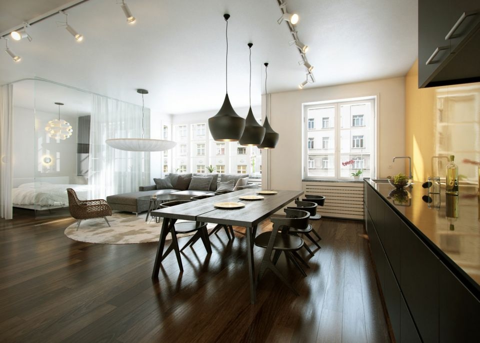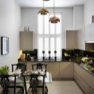 Dans une grande cuisine, plusieurs options d'éclairage coexistent généralement de manière pacifique: un lustre traditionnel au-dessus de la table à manger, des lampes suspendues ou des lampes à LED dans la zone de cuisson.