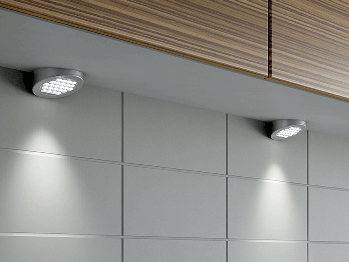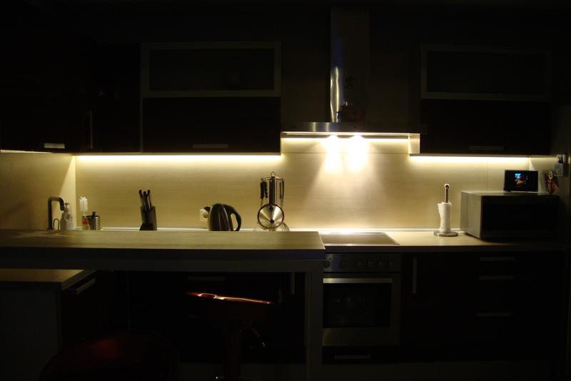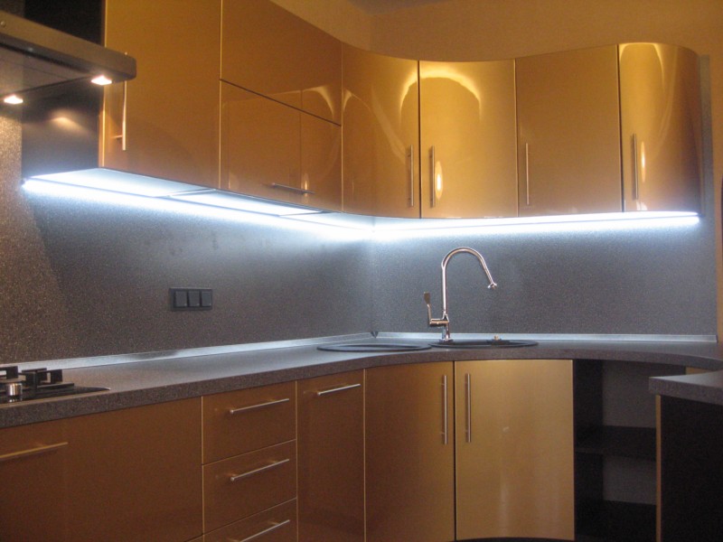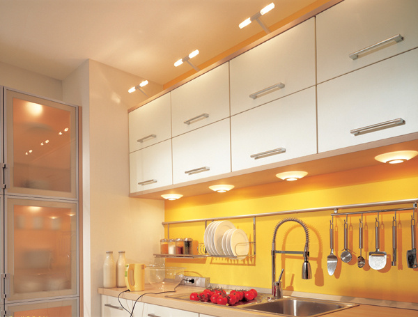 Ces modèles sont très populaires. Le plus souvent, avec leur aide, créent un éclairage de fond dans la zone de cuisson. À une distance de 50 cm les uns des autres sur l’ensemble du mur, les lampes sont encastrées dans des cloisons en placoplâtre ou dans un plafond suspendu.
