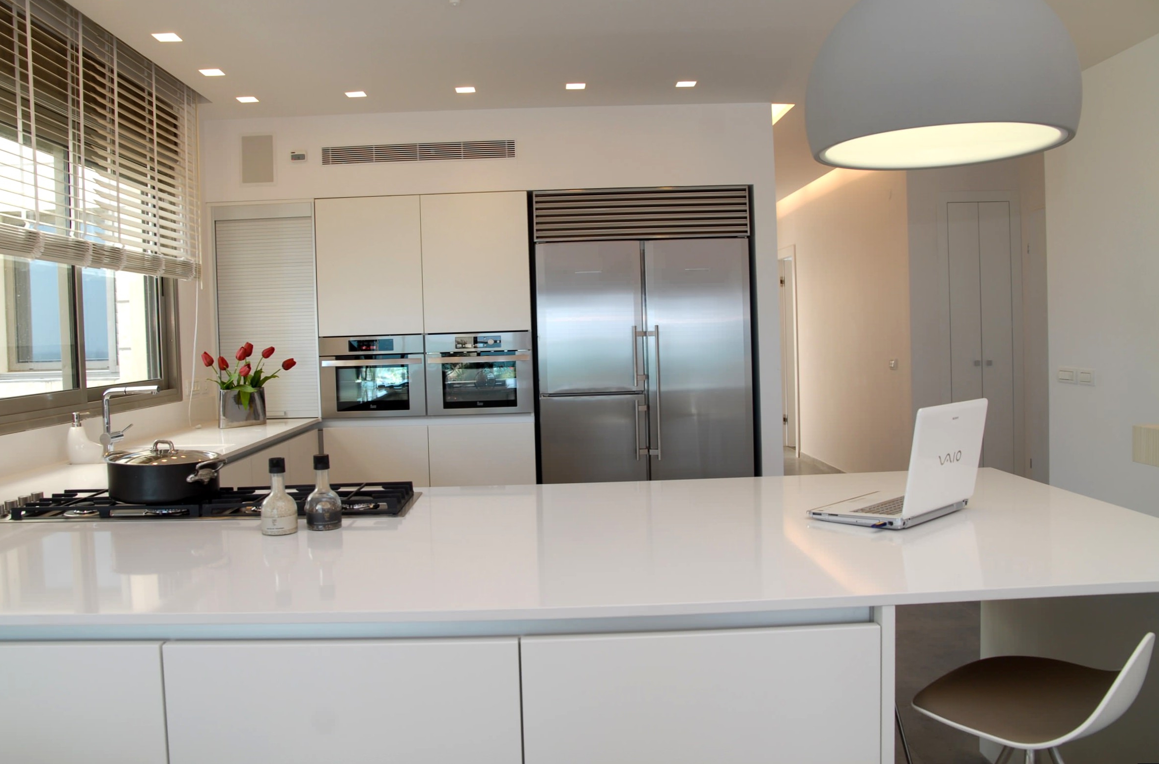 - Des lignes parallèles de bandes de LED sur toute la longueur du plafond complètent le style minimaliste de la cuisine.
