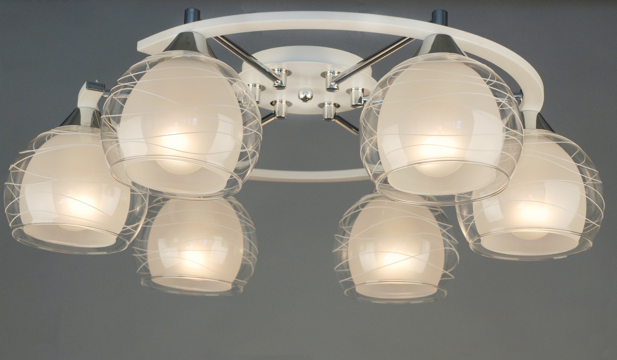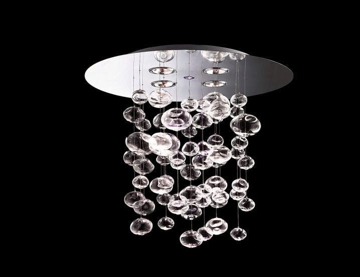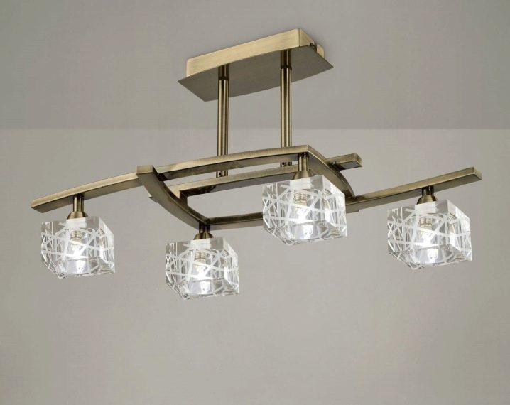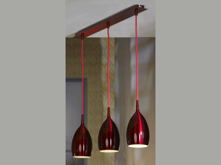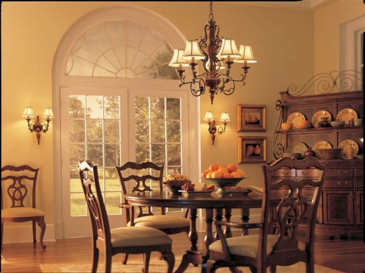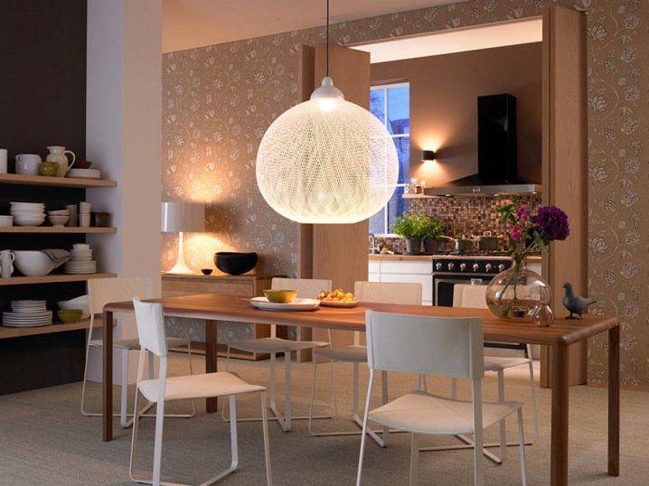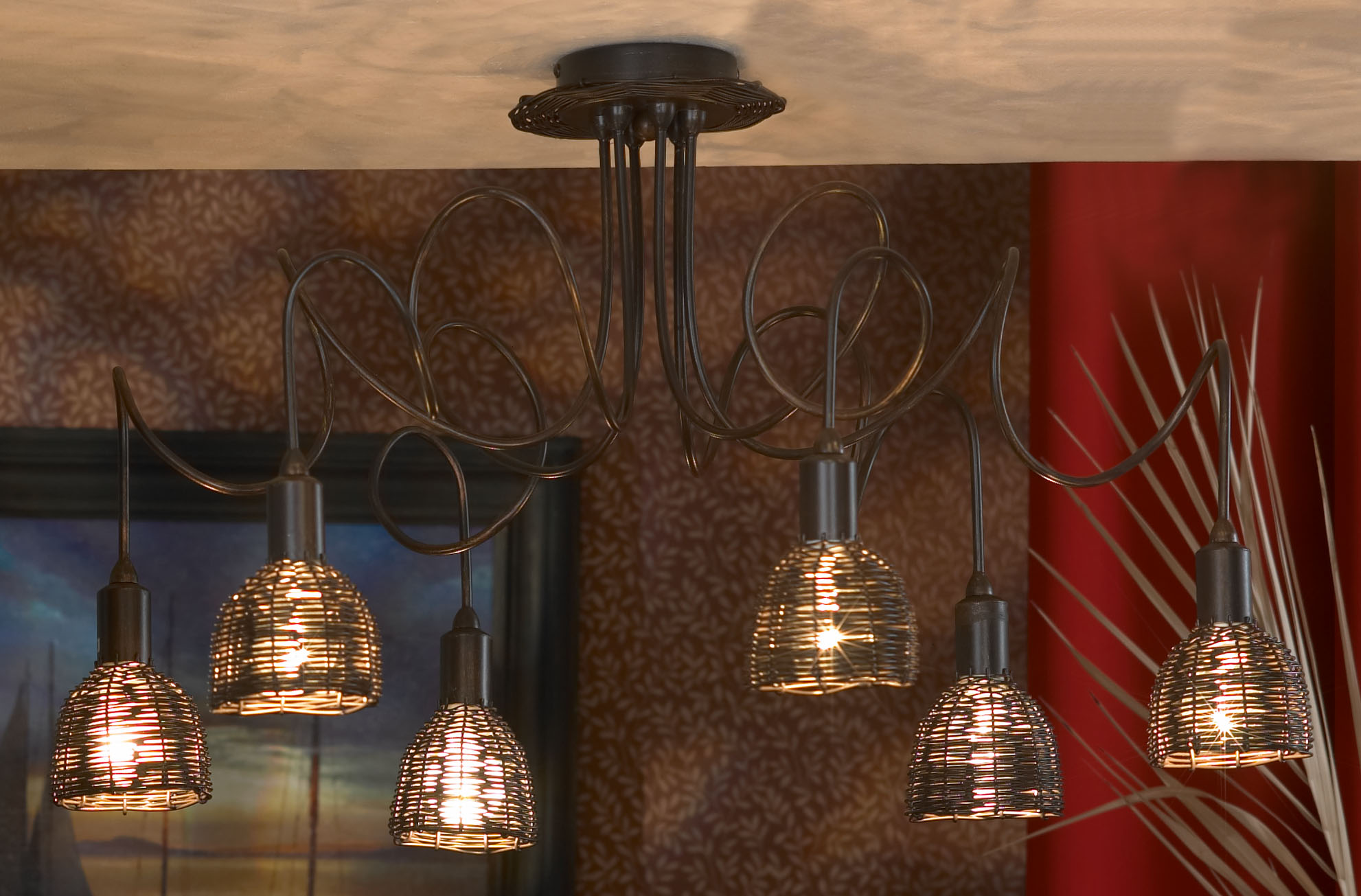 Les matériaux utilisés dans les lampes, standard - métal, verre.Mais il est permis d'appliquer et de concevoir des choses. Par exemple, une lampe en osier aura fière allure dans la cuisine. Vous pouvez également utiliser une variété de détails en bois et en liège dans les lustres. Tout dépend de votre intérieur et de votre envolée.