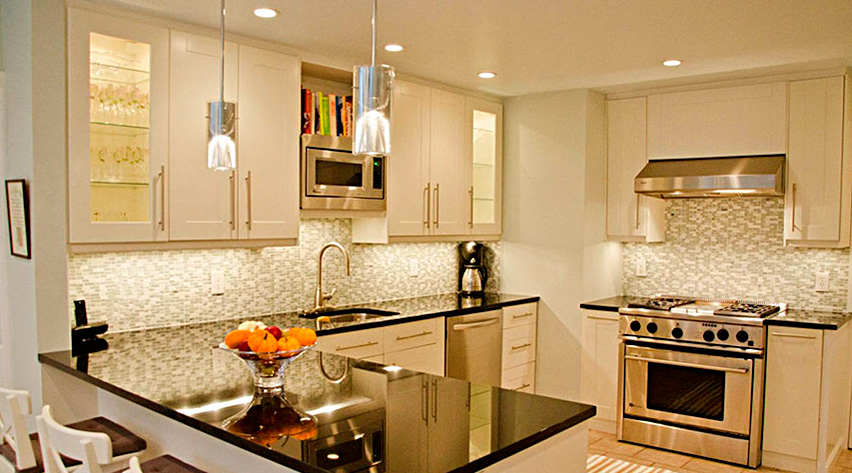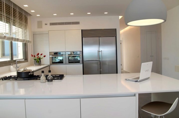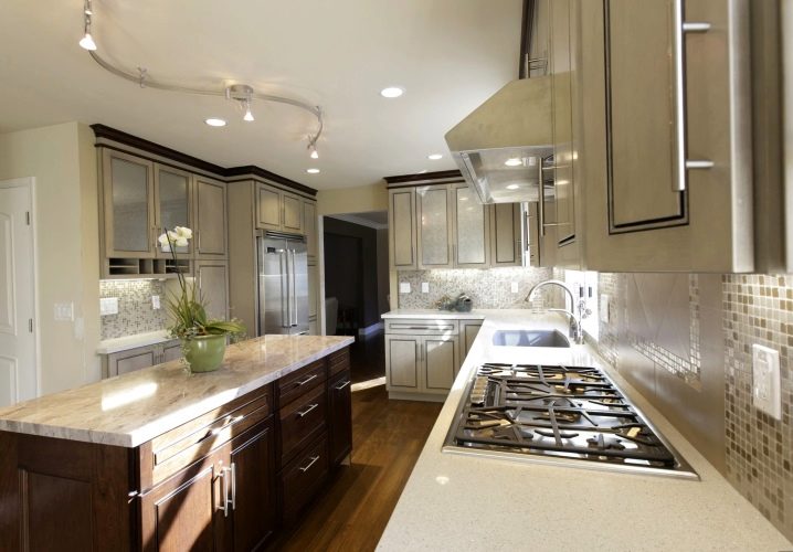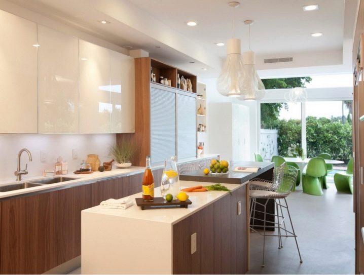 Ce type d'éclairage est parfait si votre cuisine a des plafonds suspendus ou suspendus. Dans la plupart des cas, ils sont utilisés comme point fort local. Mais il existe des options de conception lorsque des projecteurs sont utilisés pour éclairer toute la cuisine. Surtout souvent, il est utilisé dans une petite cuisine.