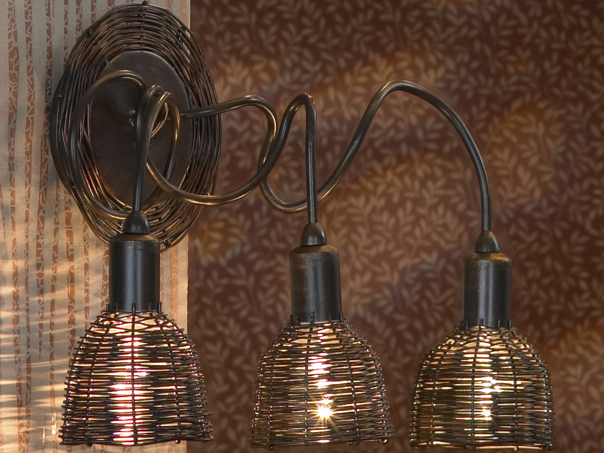 - Un abat-jour en fil de cuivre, ressemblant à un panier en osier posé sur une lampe à factures dans la zone de travail, convient parfaitement à la décoration du plafond dans un style rustique.