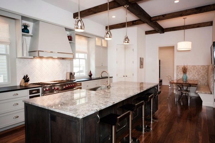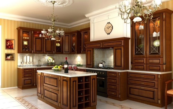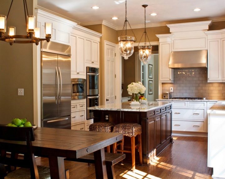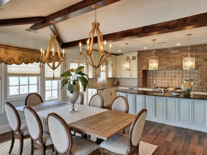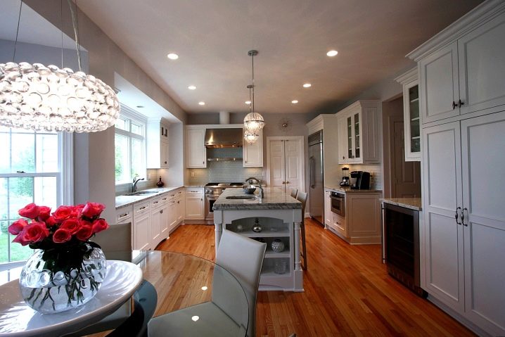 Dans les intérieurs de cuisine modernes, il n’est pas utilisé aussi intensément qu’avant. Mais dans les intérieurs classiques, elle a maintenant une place. Néanmoins, on ne peut pas s'en passer dans les grandes cuisines, où une zone distincte est attribuée à la table à manger, ce qui nécessite une lumière séparée. Beaucoup diront que le lustre est gênant, il cache l’espace, mais ce n’est pas tout à fait. Les designers modernes développent différentes formes de lustres. Ce ne sont pas seulement les plafonniers suspendus au-dessus de votre tête, ce qui n’est pas très approprié pour les petites cuisines, mais aussi diverses lampes qui s’étendent sur un plan horizontal qui ne vous dérangera pas. Bien entendu, le lustre ne pourra pas éclairer tous les coins éloignés, mais il peut être combiné avec l’éclairage local.