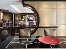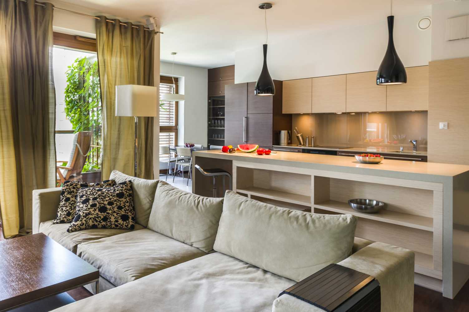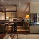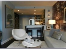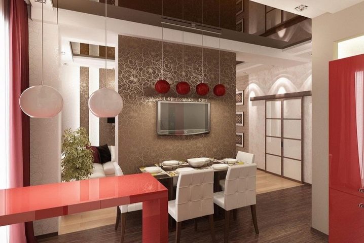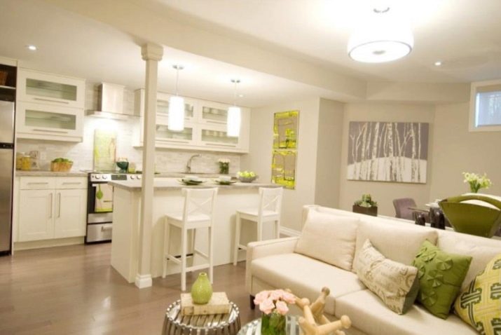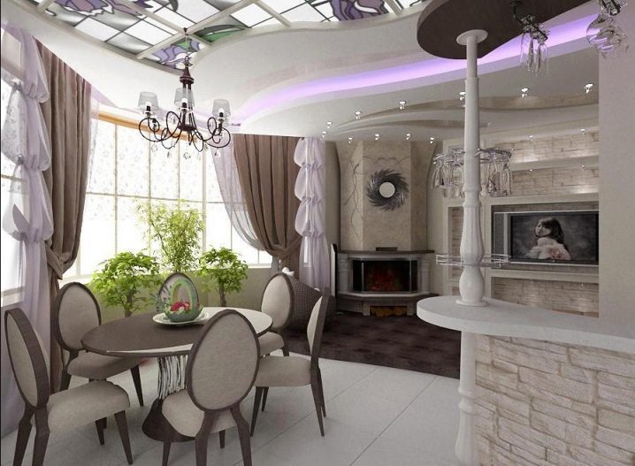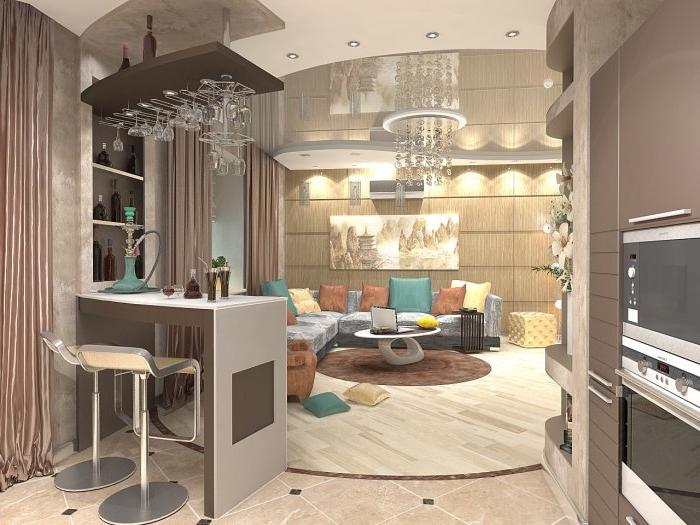 Une option courante et très populaire consiste à créer une seule salle de style café avec une partition en barres. L'idée est assez simple: à la frontière du salon et de la cuisine, un dessin rectangulaire avec un dessus de table est établi. Il s'avère que dans la cuisine, vous pouvez préparer des collations et des boissons et les servir au comptoir du salon. Sur une telle cloison, vous pouvez installer des lampes élégantes et y placer des tabourets de bar confortables.Un tel plan est récemment devenu très populaire, en particulier chez les jeunes familles.