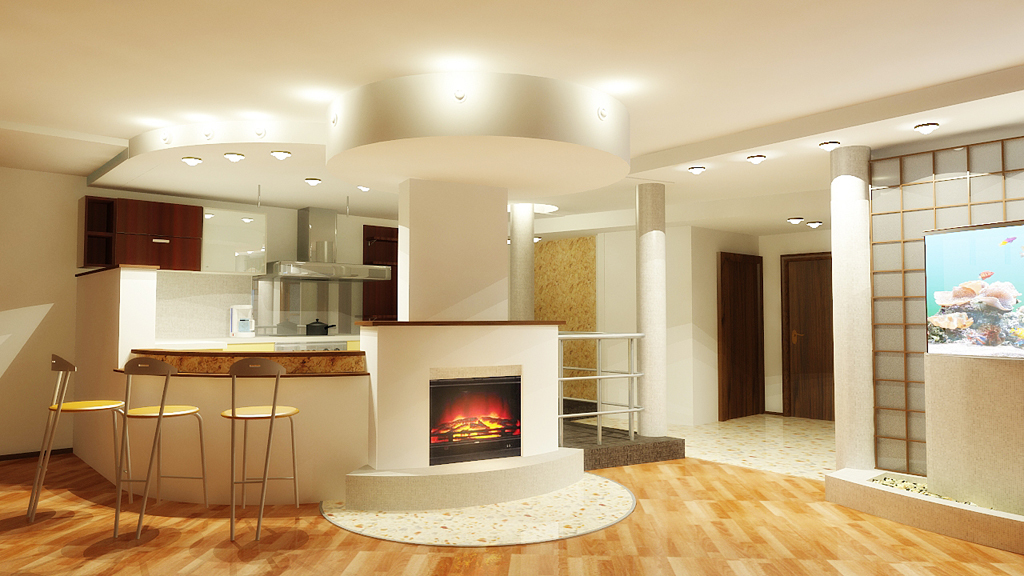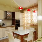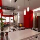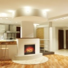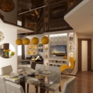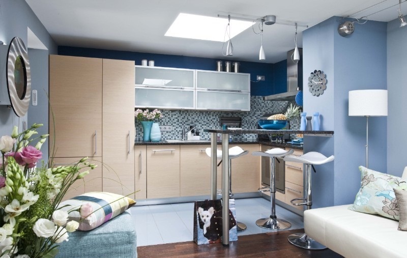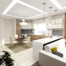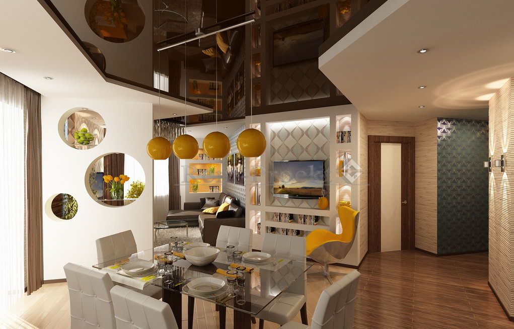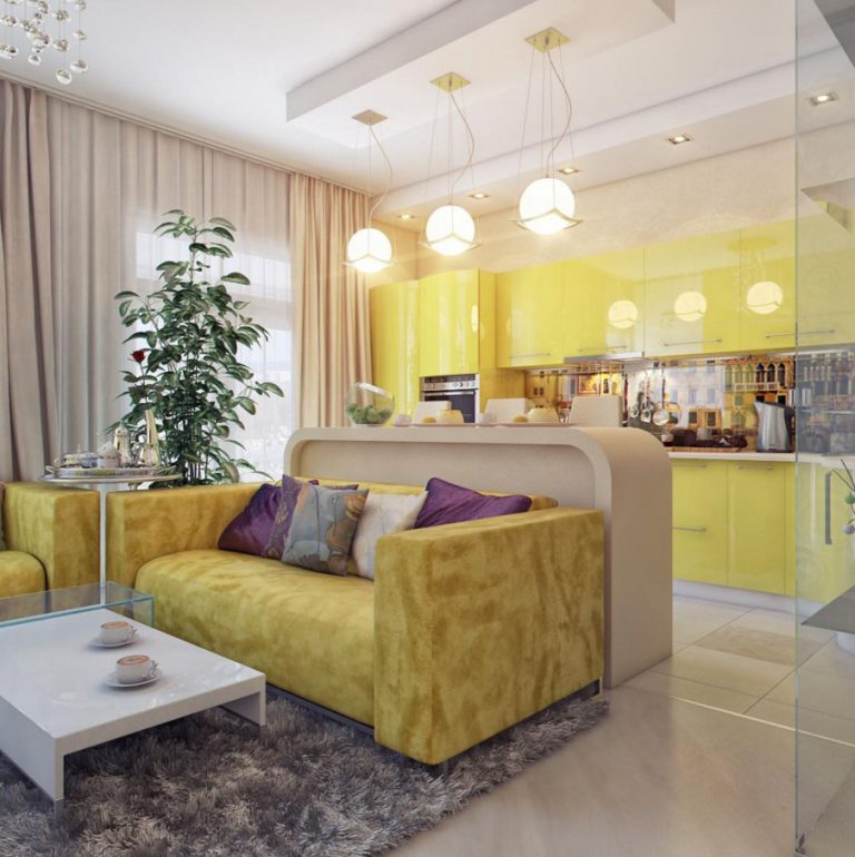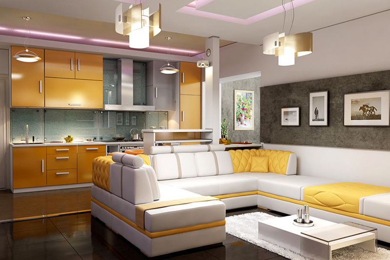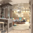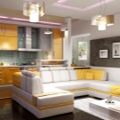 Nous pouvons distinguer les zones fonctionnelles de la cuisine-salle à manger et du salon à l'aide de l'éclairage. Installez des projecteurs intégrés dans la cuisine et dans l’autre demi-lustre au plafond ou un magnifique lampadaire. Et si vous choisissez le même éclairage pour le plafond, créez une différence de couleur: la cuisine est éclairée en jaune et le salon est bleu bleuté.