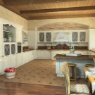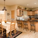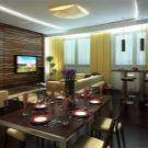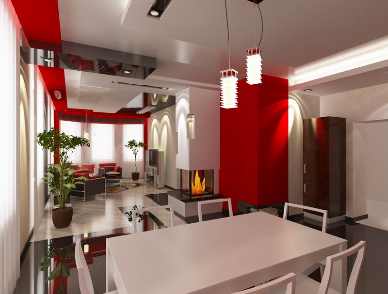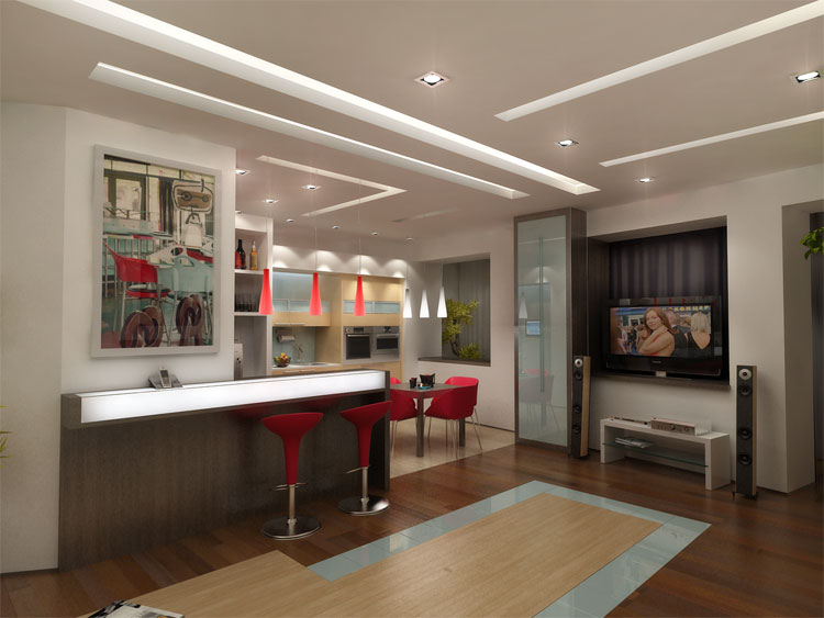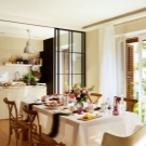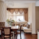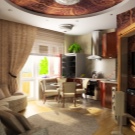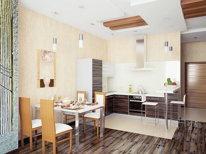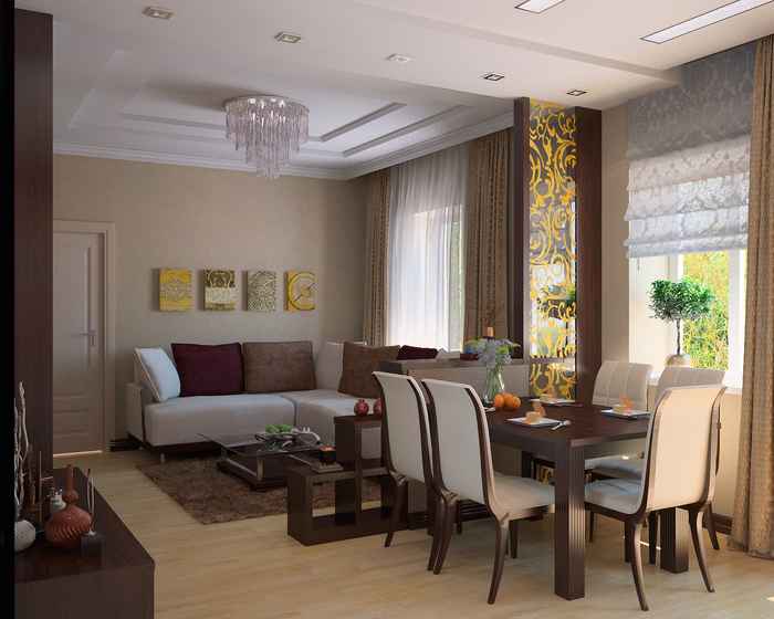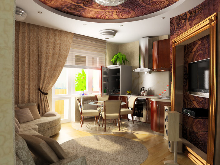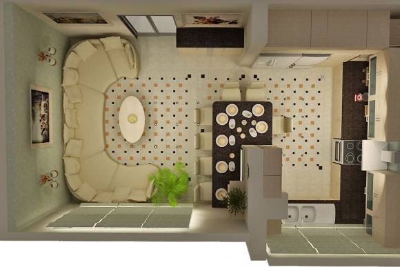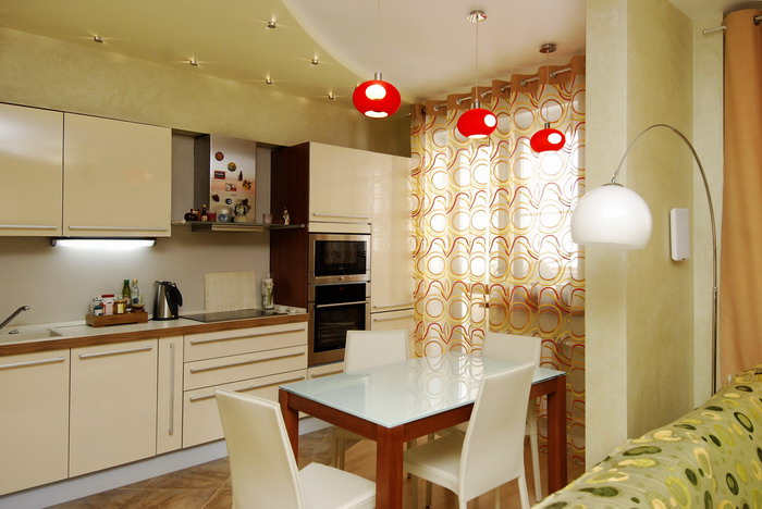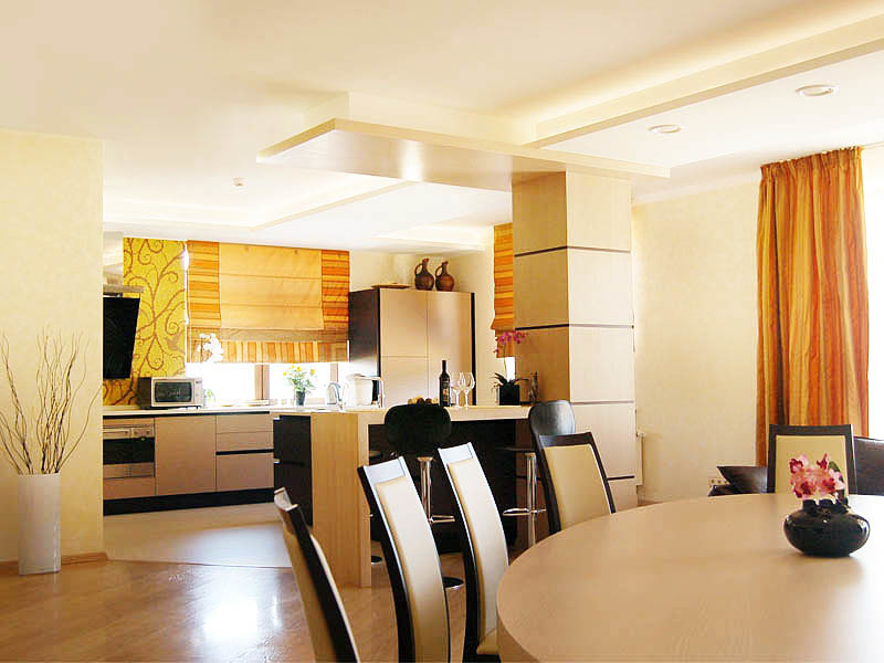 Une option simple (mais pas toujours économique) consiste à utiliser différentes méthodes de décoration intérieure des murs, des sols et des plafonds dans différents domaines fonctionnels. Vous pouvez, par exemple, carreler la cuisine avec du carrelage - c’est l’un des meilleurs matériaux pour cette pièce. Vous pouvez aussi appliquer du papier peint moderne sur la pièce à vivre et recouvrir le sol de sols stratifiés. Le plafond peut être du même matériau, par exemple, monté avec un cadre en placoplâtre et de la peinture. Et faites une transition de plafond d'une zone à une autre sous la forme d'une différence de niveau. Le contraste des matériaux de finition apportera une belle séparation visuelle des deux territoires. Avec cette méthode, il est bien sûr nécessaire de prendre en compte la combinaison harmonieuse des couleurs des matériaux de finition dans deux zones. Il est préférable de choisir des nuances proches. N'oubliez pas les meubles, qui doivent également être visuellement harmonieux dans les deux zones fonctionnelles.