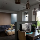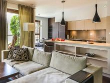 La séparation de deux ou trois zones avec du mobilier ne nécessite aucun travail d'installation. Vous pouvez simplement remettre un énorme canapé du côté de la cuisine. Et au lieu de monter le comptoir de bar décrit ci-dessus, utilisez une armoire prête ou une table à livres d'un magasin de meubles. Dans un espace de 30 mètres carrés. mètres il est possible de créer jusqu’à 3 zones fonctionnelles: pour la cuisine, une salle à manger avec une table à manger et un salon pour le reste de la famille. Ensuite, il est préférable de ne pas utiliser de cloisons ni de murs massifs, mais simplement de mettre en évidence les frontières avec des meubles ou des options de décoration variées.