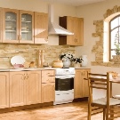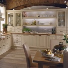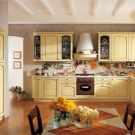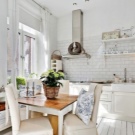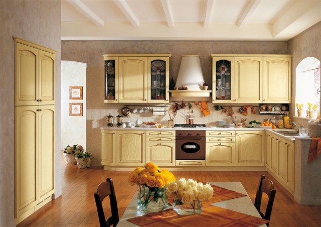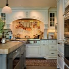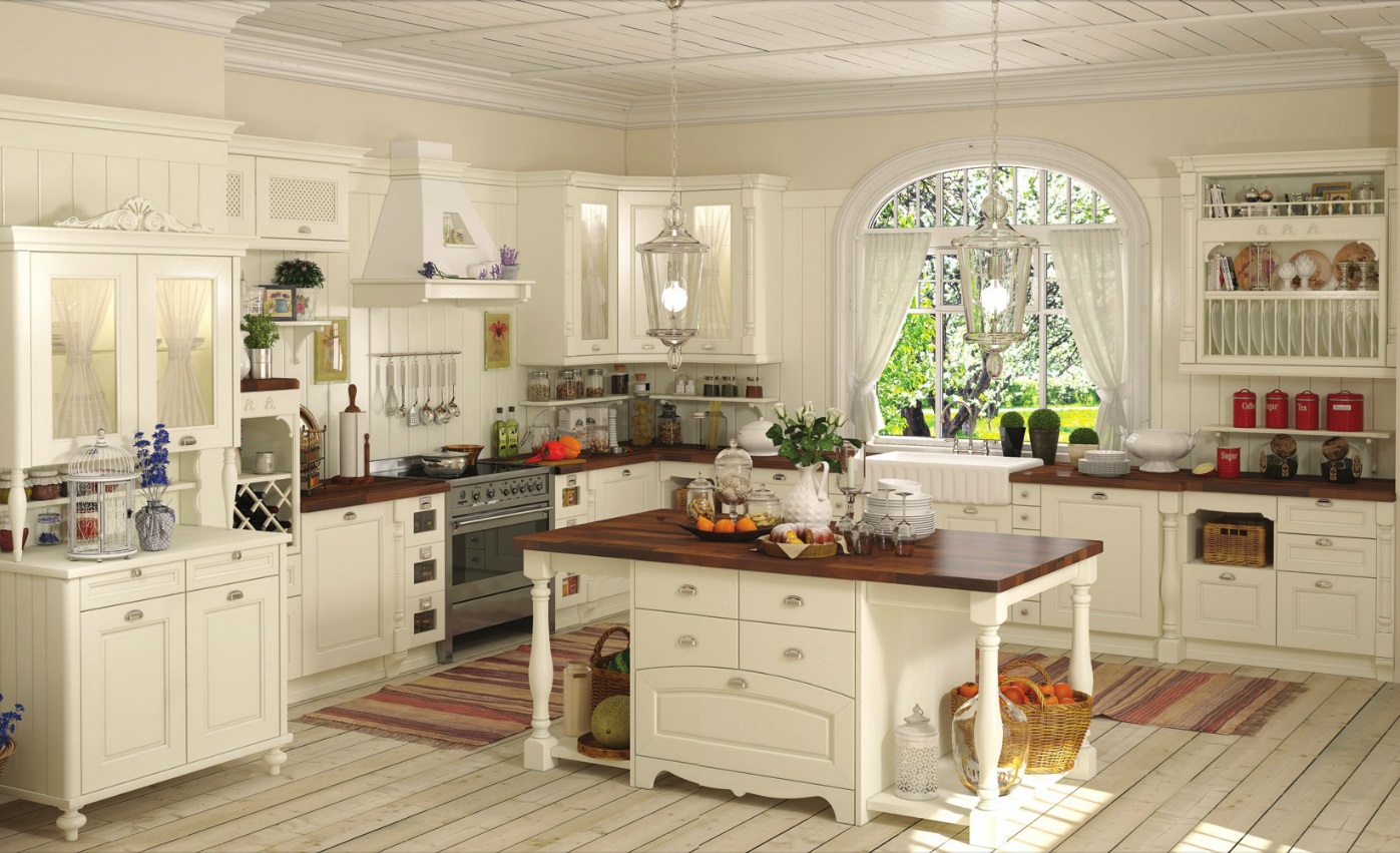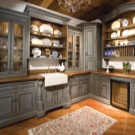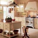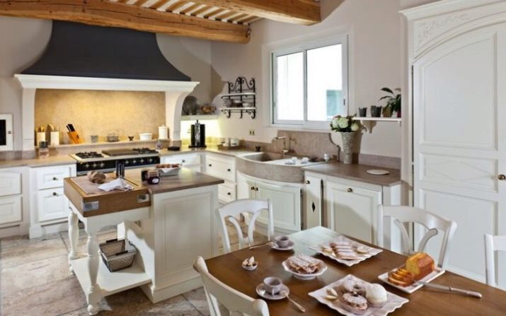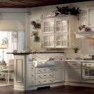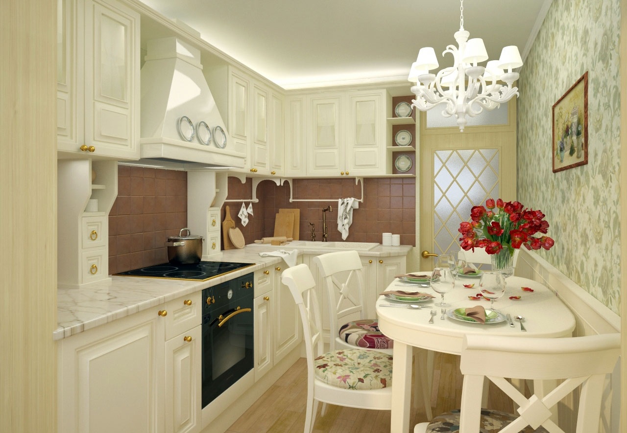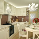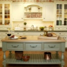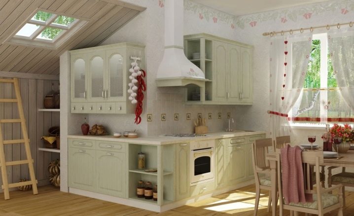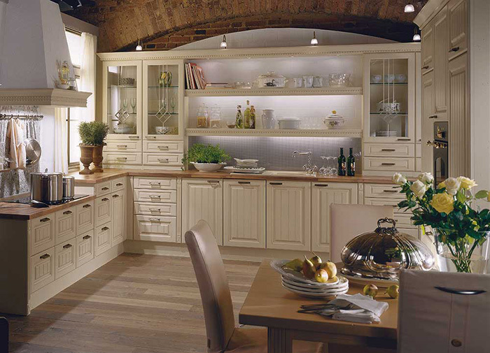 La provence - est l'une des destinations les plus romantiques. Ici, la préférence est donnée aux vieux meubles et aux matériaux donnés par la nature.La formule intérieure de la cuisine de ce style implique la présence de tons pastel délicats avec de petits accents lumineux. Pour le sol, le mieux est le stratifié avec des reliefs mal définis et non rectifiés. Parmi les options, vous pouvez proposer l’utilisation d’un panneau stratifié dans la couleur du chêne blanchi clair.