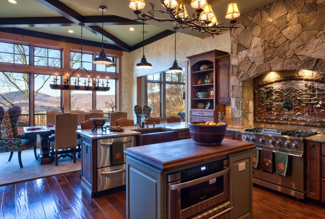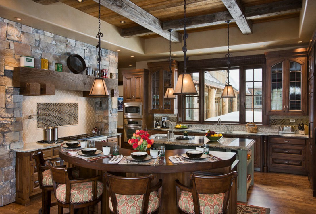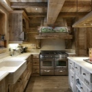 Chalet suisse - Une combinaison de bois et de pierre naturelle est une caractéristique distinctive de ce style. La combinaison d'un stratifié de couleur sombre et d'une pierre naturelle est également autorisée. Les intérieurs dans le style d'un chalet suisse avec l'utilisation d'un sol stratifié en noyer ou en frêne et de la pierre sombre se marient harmonieusement. La palette de couleurs est plus nuancée que dans le style "pays". Si vous le souhaitez, vous pouvez ajouter des traits légers en utilisant un plateau imitant une pierre claire.