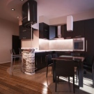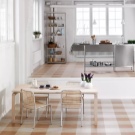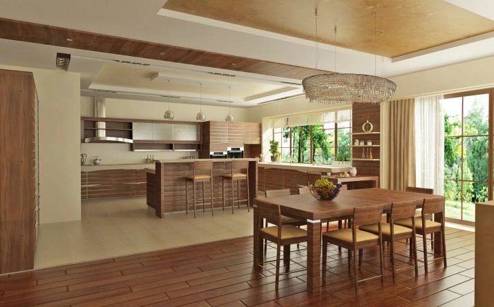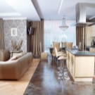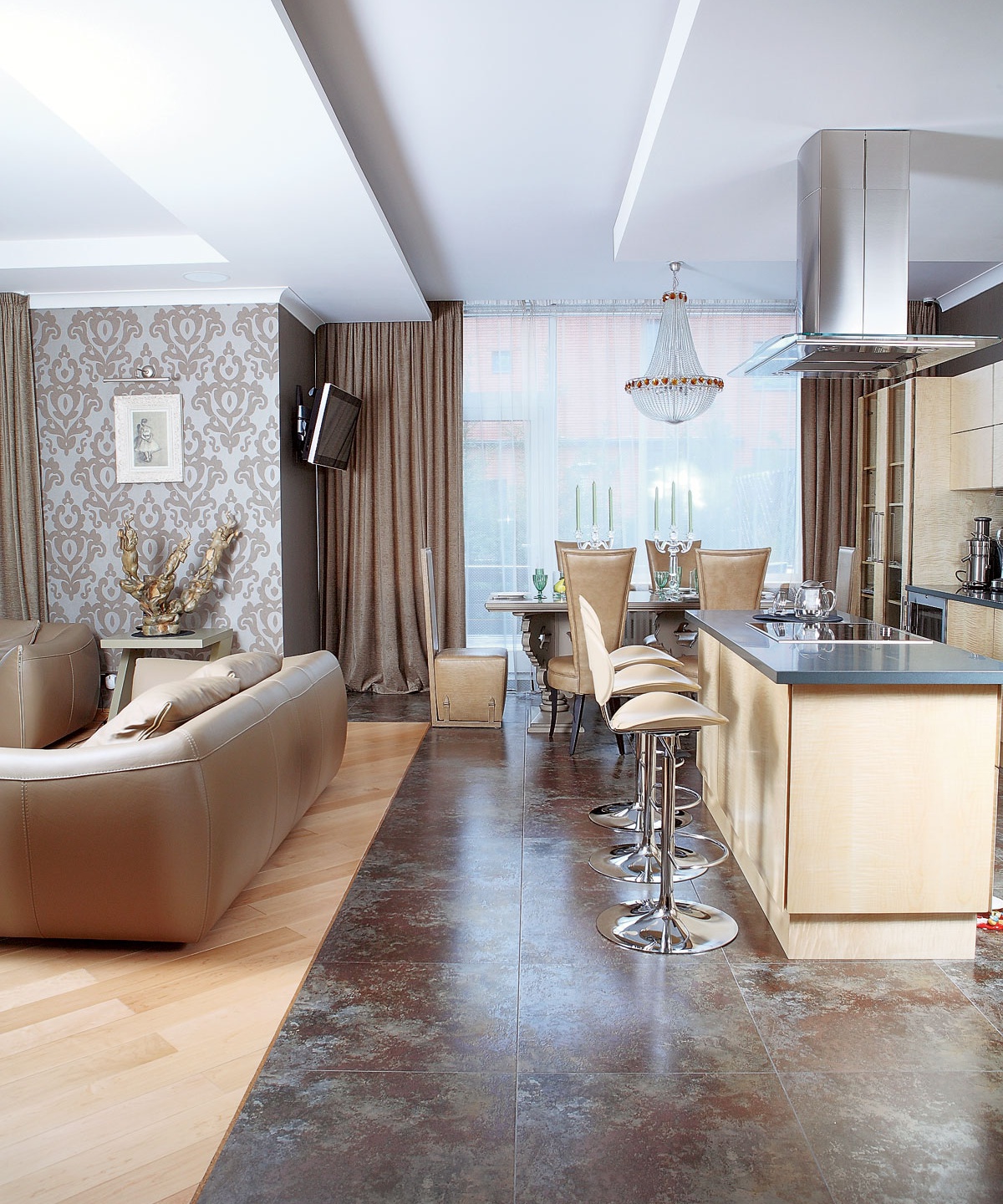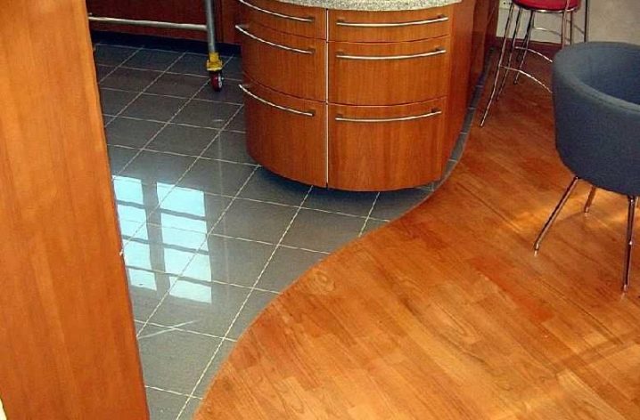Le zonage très intéressant à l'aide de carrelage et de stratifié peut être réalisé dans une pièce de grande surface, par exemple dans un studio ou lors de la combinaison d'une cuisine et d'une salle à manger. Si vous avez une superficie de 33 à 34 mètres carrés, vous pouvez la diviser en plusieurs zones visuelles, en utilisant une combinaison de matériaux intéressante. il est même possible de combiner trois matériaux: le linoléum, le stratifié et les carreaux. Dans tous les cas, tenez compte de toutes les caractéristiques des matériaux sélectionnés, réfléchissez à tous les détails - où le type de revêtement est le mieux placé, comment choisir les bonnes couleurs et les bonnes textures. Avec la bonne approche, vous réussirez et votre revêtement de sol vous servira pendant de nombreuses années.