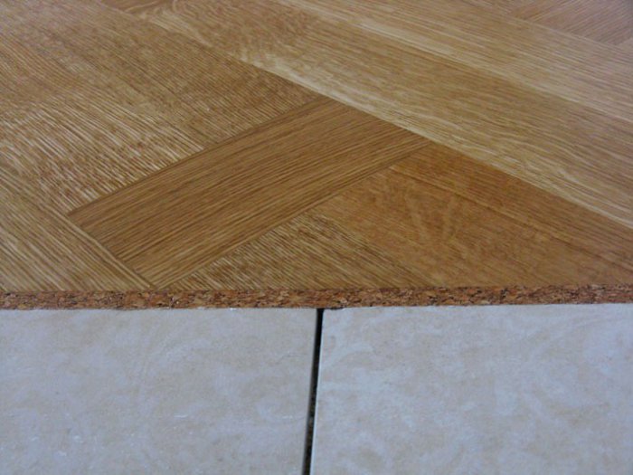 - en utilisant un compensateur de liège. À la jonction des revêtements, une bande de liège est collée. Le stratifié sur le bord doit être nécessairement traité avec un moyen de protection contre l'humidité;