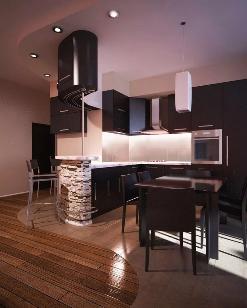 La solution la plus réussie et la plus pratique lors du choix d’un revêtement de sol pour la cuisine consiste à combiner un stratifié et un carrelage. Avec cette combinaison, vous pouvez afficher le zonage visuel de l'espace de la cuisine (les carreaux sont généralement disposés sur l'espace de travail et le revêtement de sol stratifié) de l'espace salle à manger, tout en facilitant l'entretien du revêtement de sol.