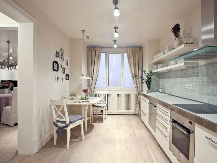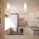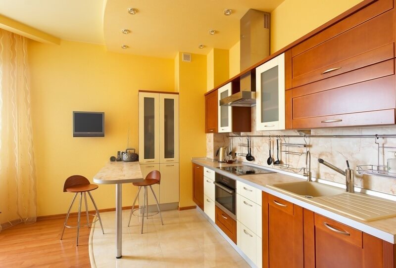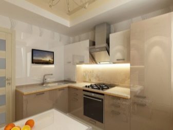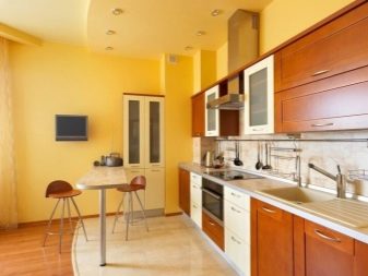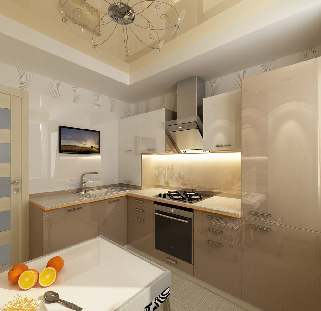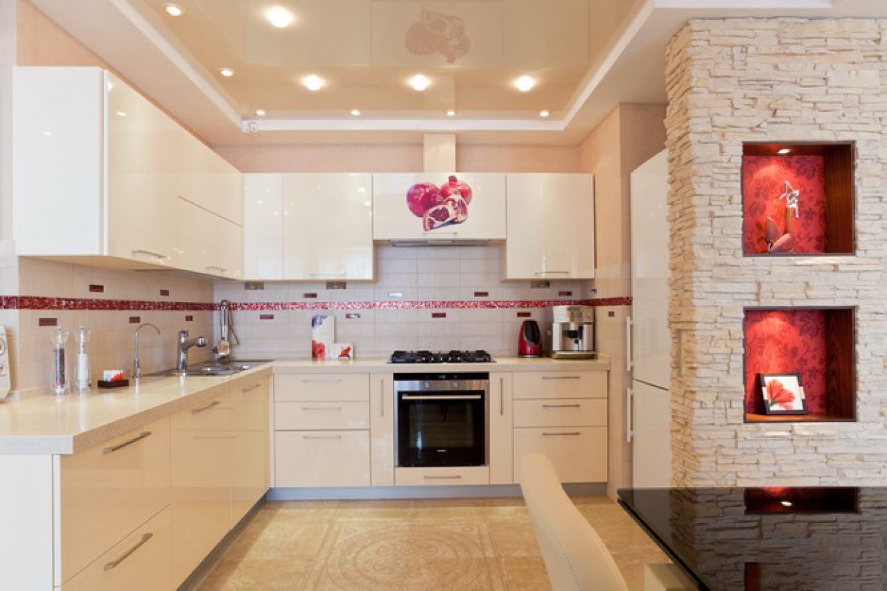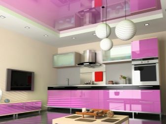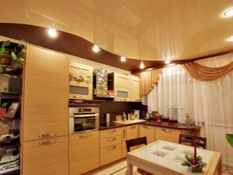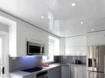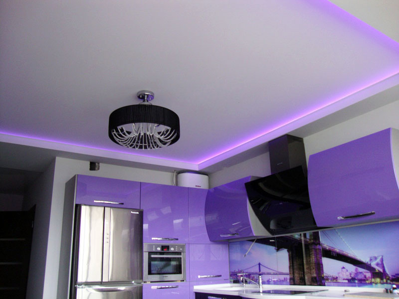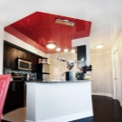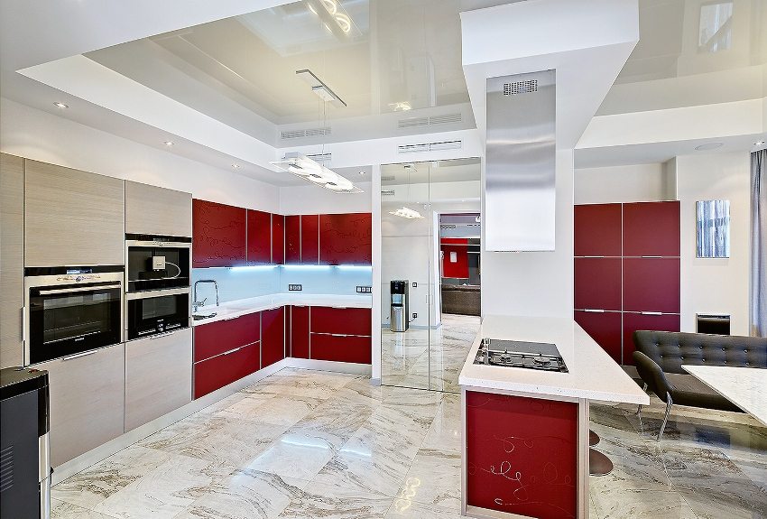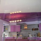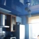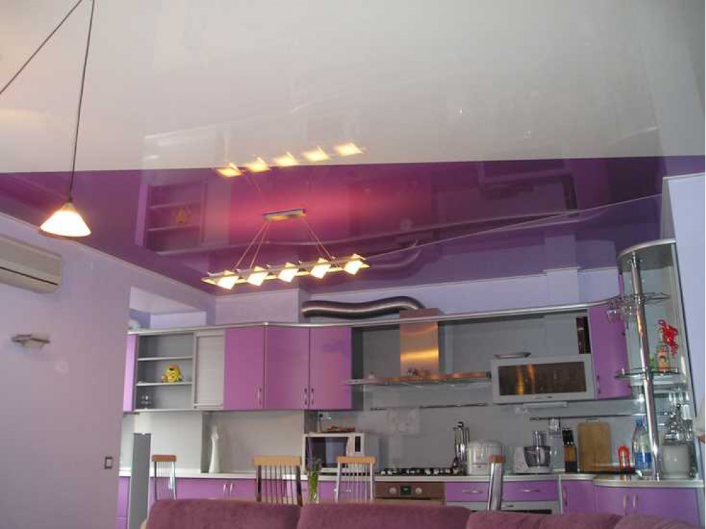 Au prix coûtant, les plafonds tendus brillants sont supérieurs au mat. Mais ils ont aussi des avantages indéniables: un vaste choix de couleurs. Vous pouvez choisir la bonne couverture pour tout type de cuisine. Une autre caractéristique de ce revêtement est une bonne réflexion de la lumière et la création d'un effet de miroir.De ce fait, les plafonds brillants augmentent visuellement la pièce, créent une impression de volume supplémentaire, ce qui est très important pour les cuisines de très petite taille avec des plafonds bas.