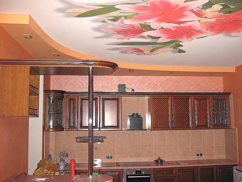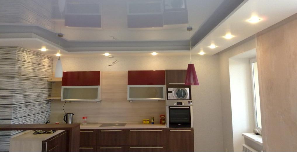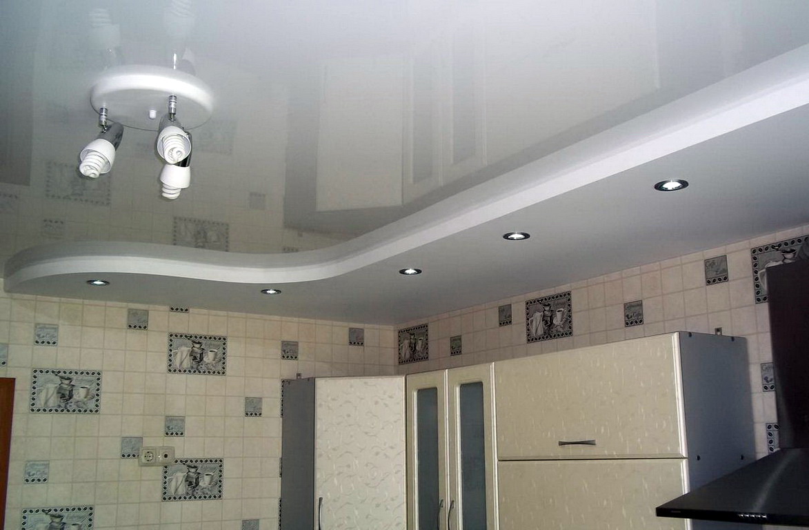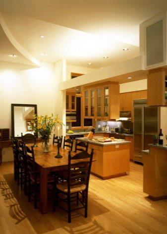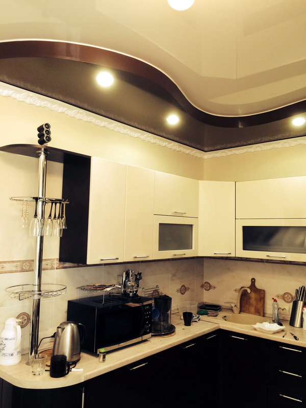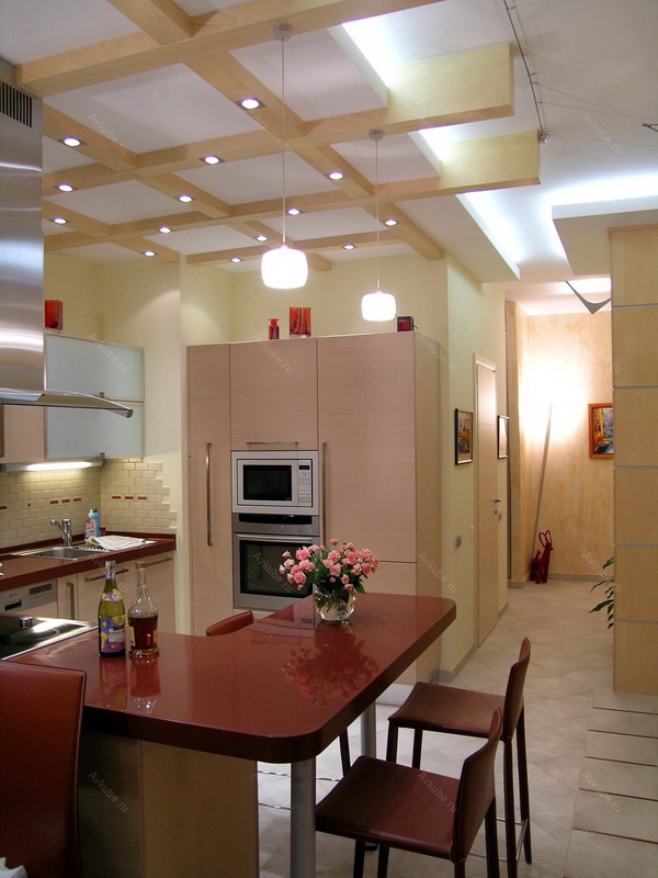 Si le milieu du plafond de la cuisine sur deux niveaux doit se présenter sous la forme d’un écran et l’organiser avec un papier peint avec un thème de cuisine ou un miroir, cette solution sera très originale et fera toujours plaisir à vous et à vos invités.