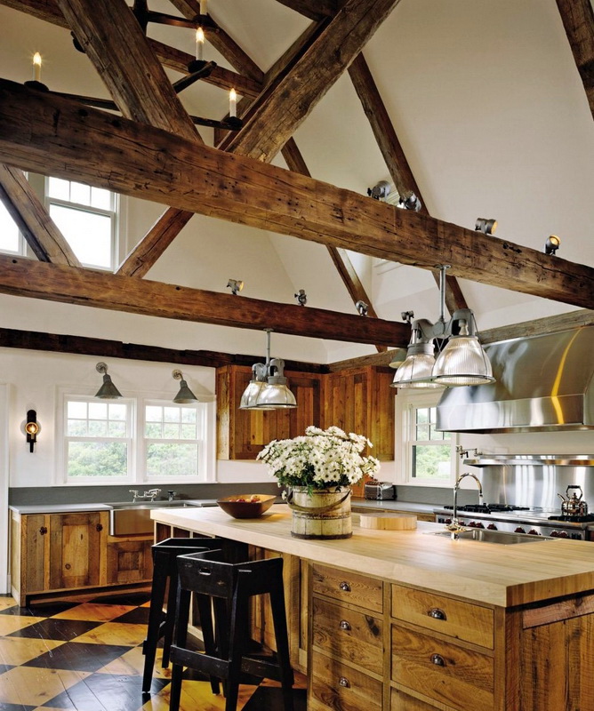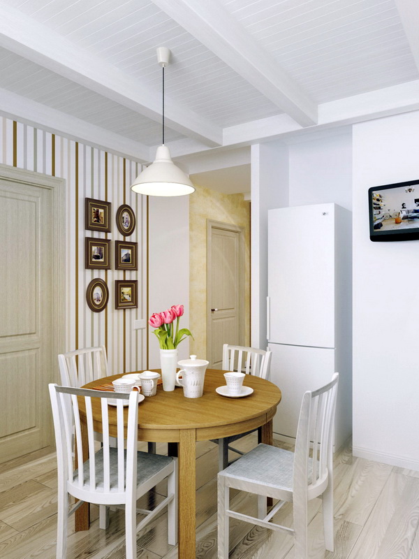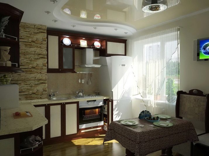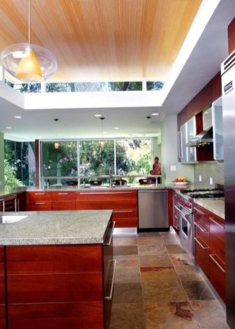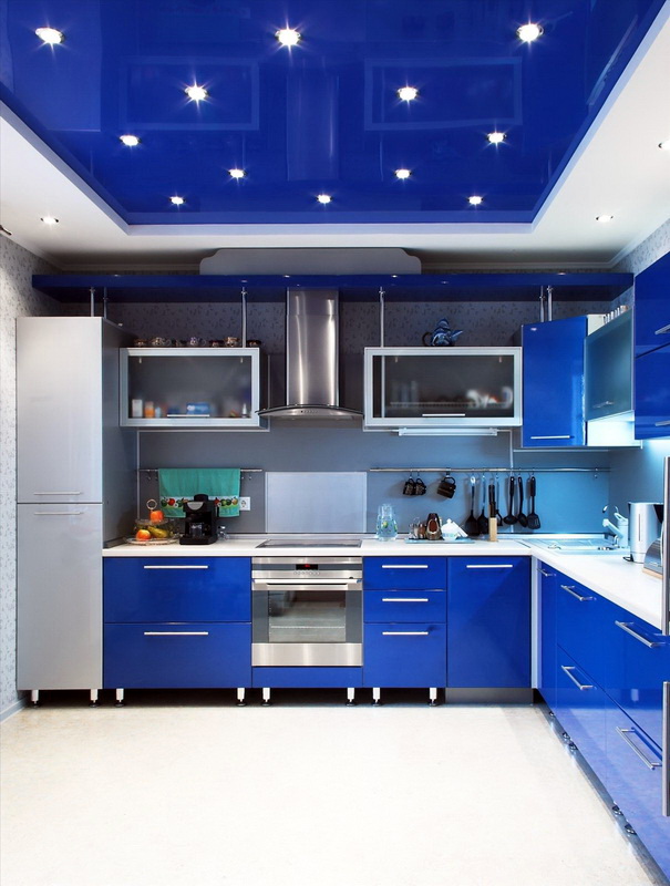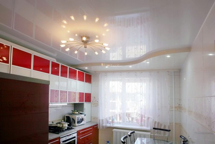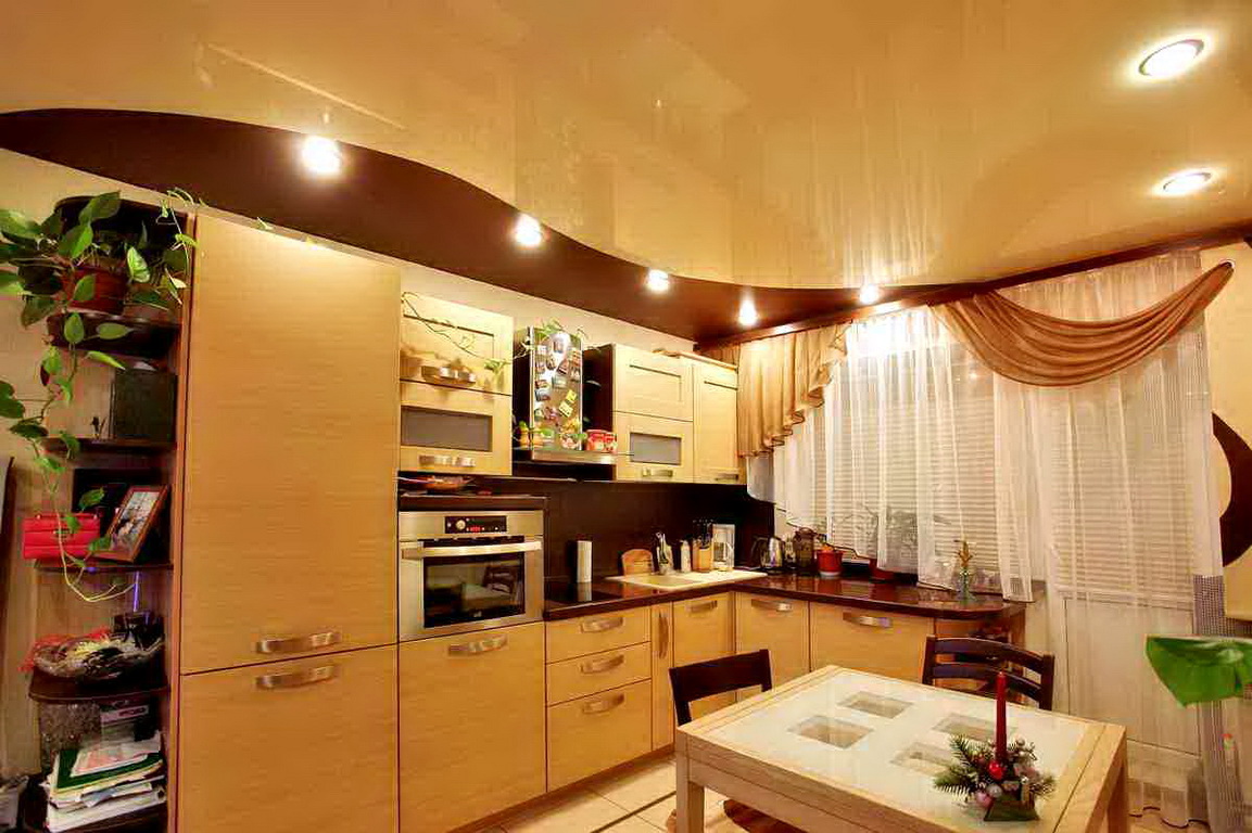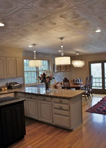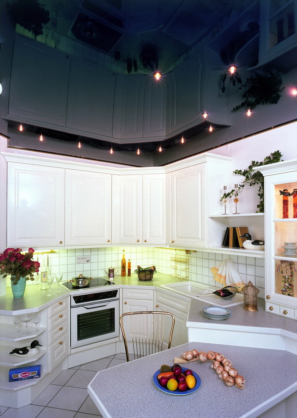 En réfléchissant à la conception du plafond de la cuisine, rappelez-vous de la conception dans laquelle la cuisine elle-même est maintenue: meubles, appareils de cuisine, sols, murs. En fin de compte, tout devrait être harmonieusement combiné.