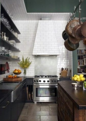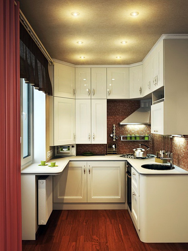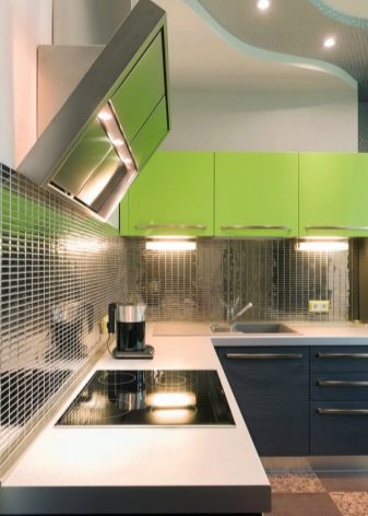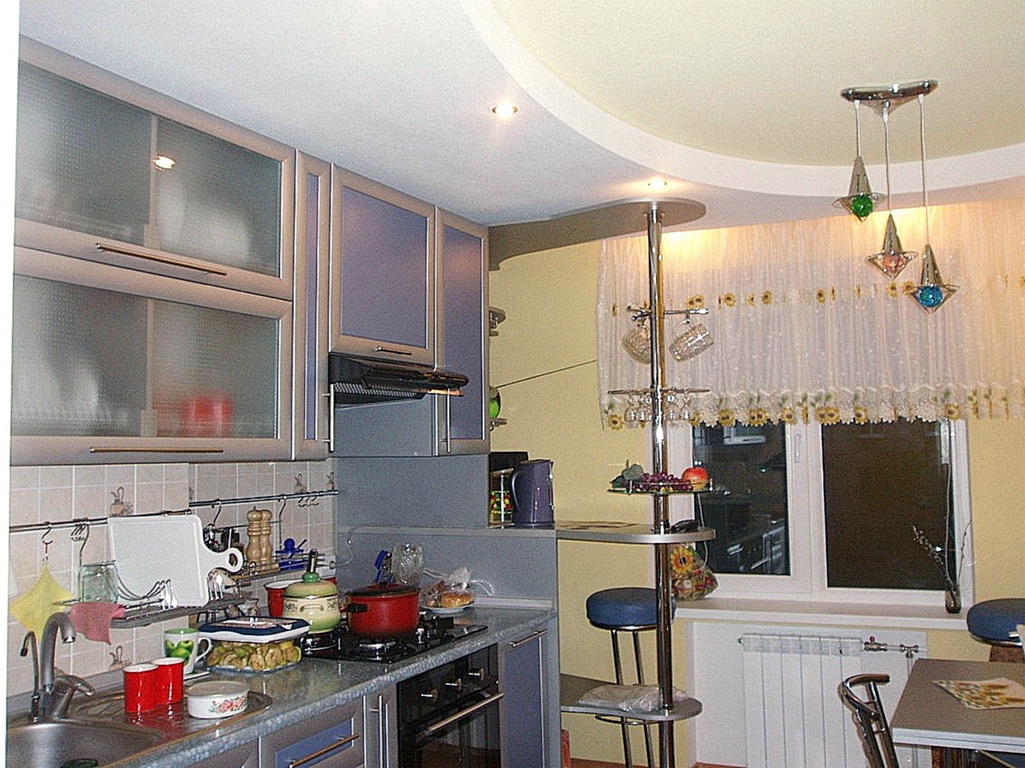 Pour une cuisine d’une superficie d’environ 9 mètres carrés avec des plafonds standard de 2,5 à 2,7 mètres, vous pouvez donner le même conseil, bien qu’il vous soit également possible d’utiliser le plafond à charnière en plaques de plâtre pour le retirer de la encombrer l'espace de la cuisine.