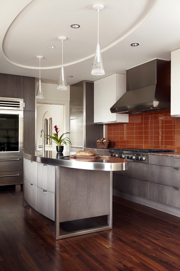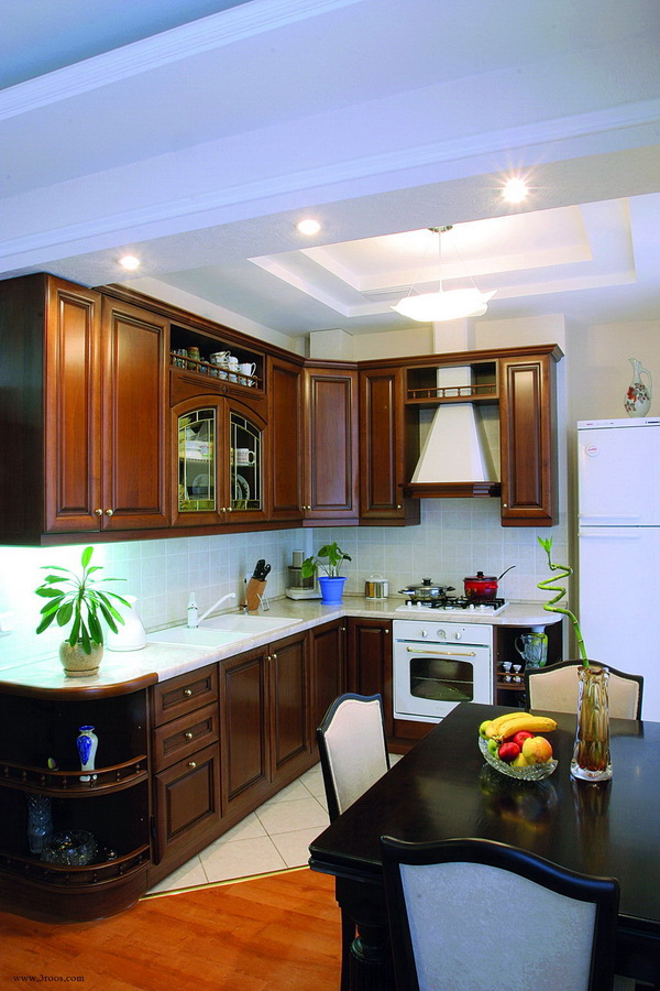 La conception des plafonds suspendus en plaques de plâtre avec des courbures ou des arrondis rendra l'espace de la cuisine plus spacieux, mais un plafond articulé à angles droits lui donnera clarté et sophistication classique.