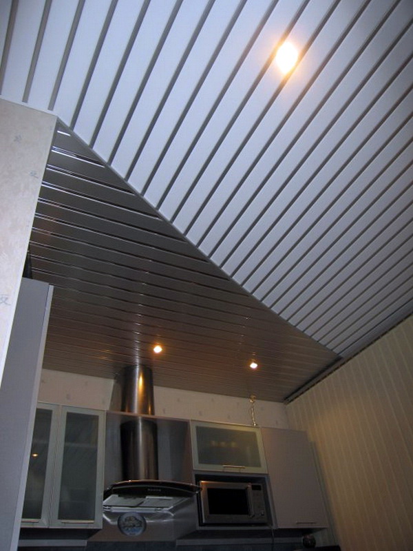 En raison de l'humidité élevée d'une pièce telle qu'une cuisine, les lattes qui composent le cadre doivent être en aluminium. Ce métal n'a pas peur de la corrosion, ainsi le plafond de la cuisine ne se détériorera pas.