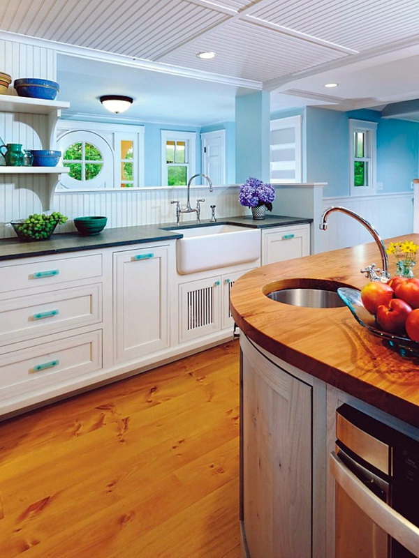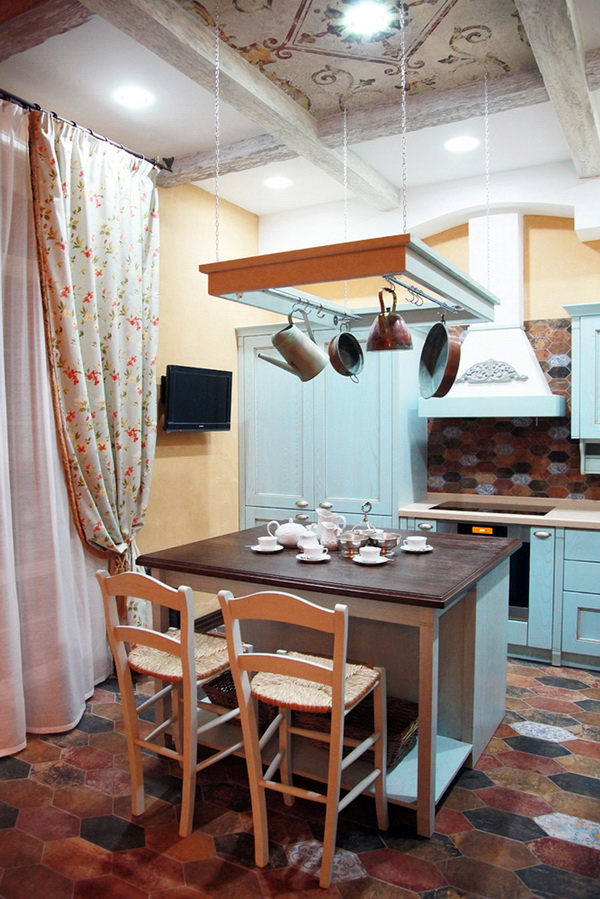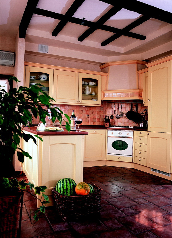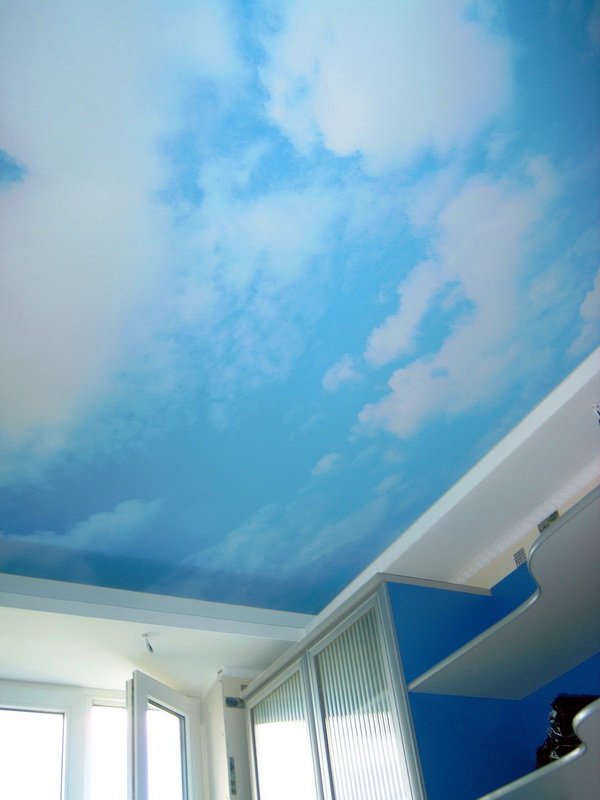 Bien entendu, un tel plafond ne doit être peint qu'avec de la peinture légère - bleu ciel ou beige. Ainsi, l'espace de la cuisine va se développer visuellement.