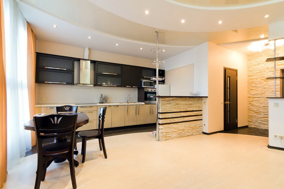 La conception est pratique car elle comporte un espace suffisamment creux dans lequel vous pouvez masquer toutes les communications techniques telles que les conduits d’air, le câblage électrique et les plafonniers intégrés. En outre, un plafond suspendu constitue une isolation phonique supplémentaire et constitue un avantage non négligeable pour un appartement situé dans un immeuble de grande hauteur.