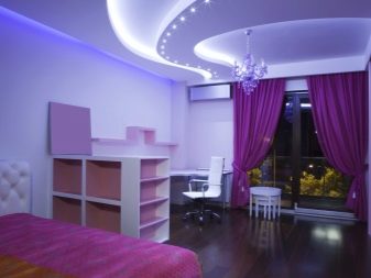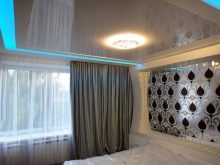 - Une niche bien faite ne doit pas créer de rides à tous les niveaux de rideaux, y compris les lambrequins. Le rétro-éclairage n’est pas installé sur la corniche elle-même, mais devant la boîte, mais il attire toujours l’attention sur le haut inhabituel des rideaux, orné de swaggy.La texture mate du revêtement de plafond vous permet d'ajouter une pièce au confort. De telles variations conviennent aux pièces dans lesquelles il est nécessaire de créer une atmosphère mystérieuse.