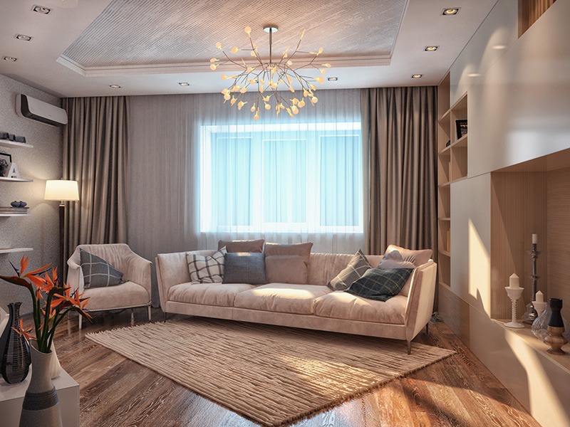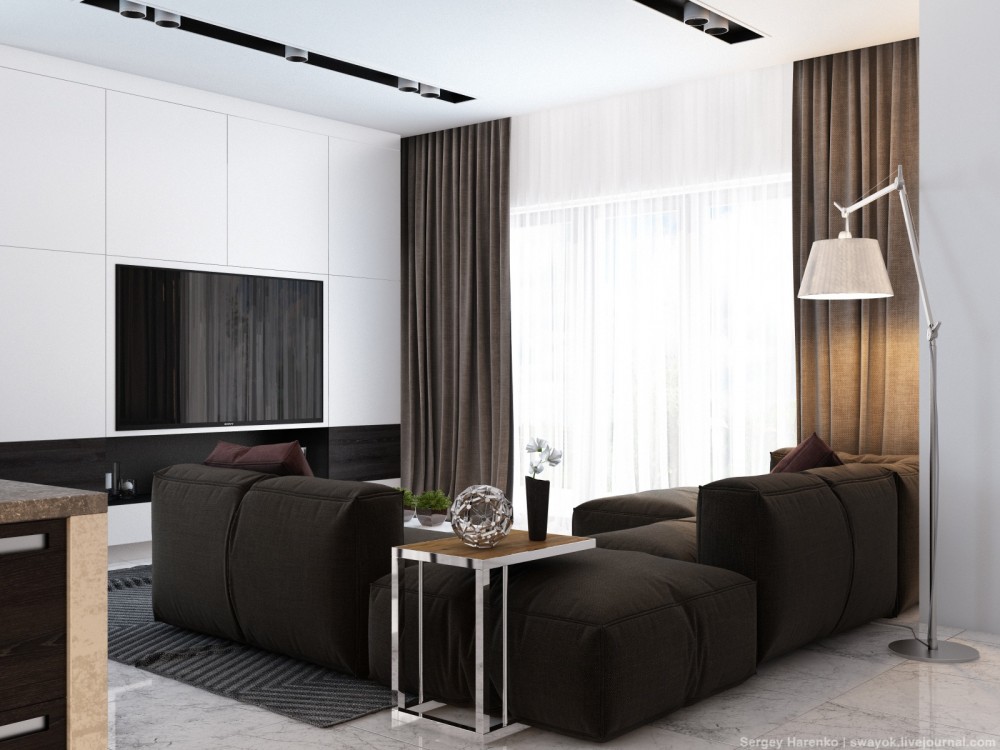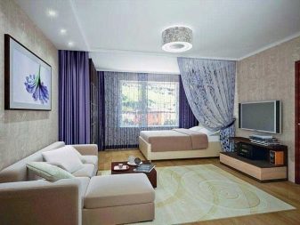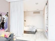 Pour un appartement d'une chambre, il est important de créer deux zones fonctionnelles ou plus dans la même pièce. Les rideaux au milieu de la pièce aident à cela. Le haut des rideaux translucides est caché dans une niche qui occupe tout le mur. Fune réception approuvée à la fois combinait la pièce et la divisait en divisant la conception de l’espace au plafond.
