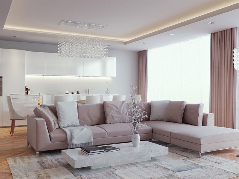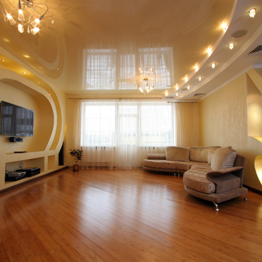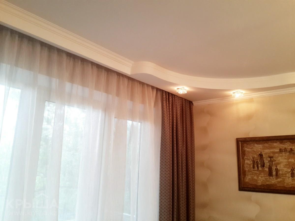 - Les revêtements brillants sont généralement utilisés pour les avant-toits illuminés. Cependant, dans ce cas, ce choix nous a permis de mettre en valeur la majesté de la salle. La boîte permettait de dissimuler la tringle à rideau pour qu’elle ne retienne pas l’attention du plafond arrondi à plusieurs niveaux. La couleur blanche est devenue un excellent choix.