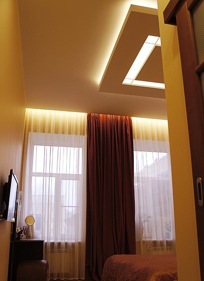 - Une niche sous le rideau est équipée le long du mur d'une ouverture de fenêtre. Cette option est souvent utilisée pour les pièces rectangulaires étroites, plaçant les rideaux à l'avenir le long de tout le mur. Cette option est généralement définie par le rétroéclairage, mais pas toujours. Tout dépend du niveau d'éclairage de la pièce et de la conception des rideaux.
