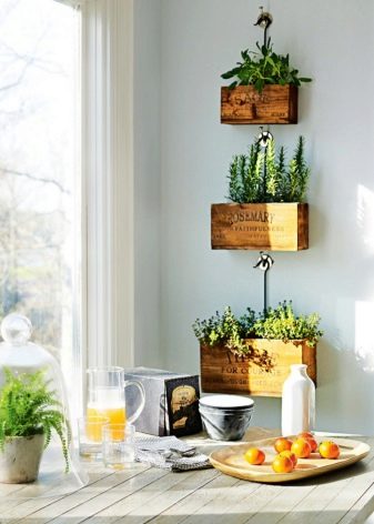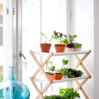 Les pots avec des herbes parfumées peuvent être placés sur des étagères spéciales près de la fenêtre et sur le rebord de la fenêtre elle-même. Ici la présence principale de la lumière.