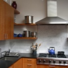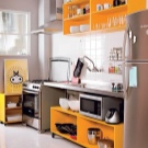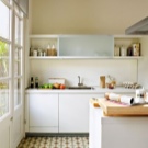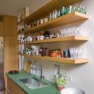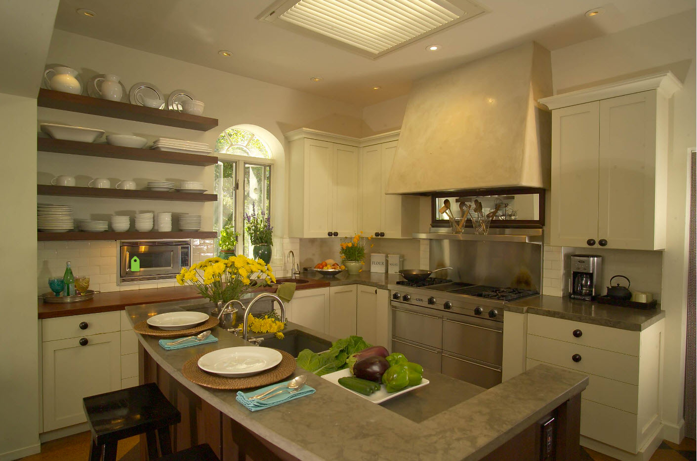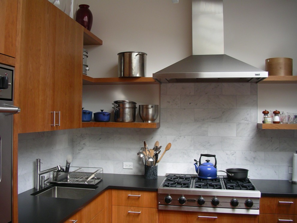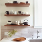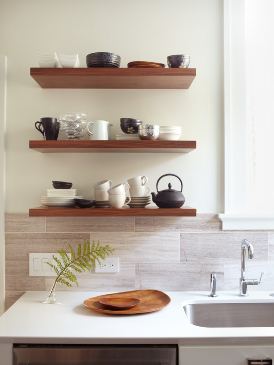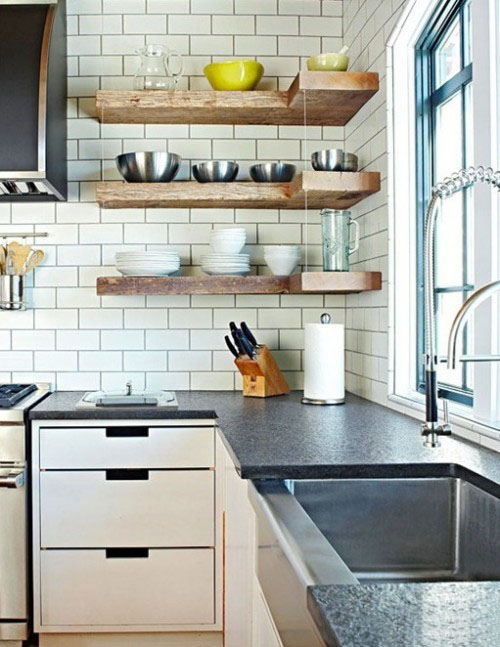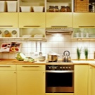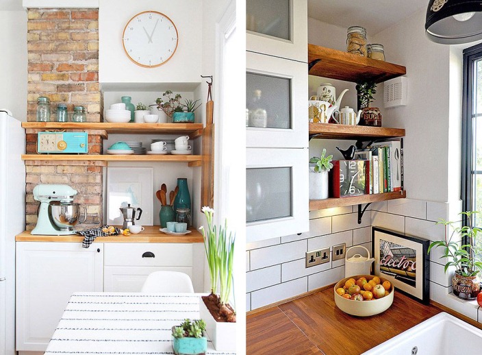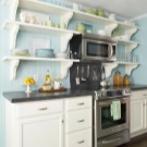 Tout d'abord, décidez où vos étagères seront situées.Il est déconseillé de placer les étagères ouvertes à côté du poêle. Dans ce cas, il est tout à fait possible qu’ils se tachent très rapidement de graisse. La meilleure option pour l'emplacement des concepteurs considère l'emplacement au-dessus de la zone de cuisson. Dans ce cas, les étagères et leur contenu ne seront pas encrassés par la graisse, en plus, tout le nécessaire sera à portée de main.